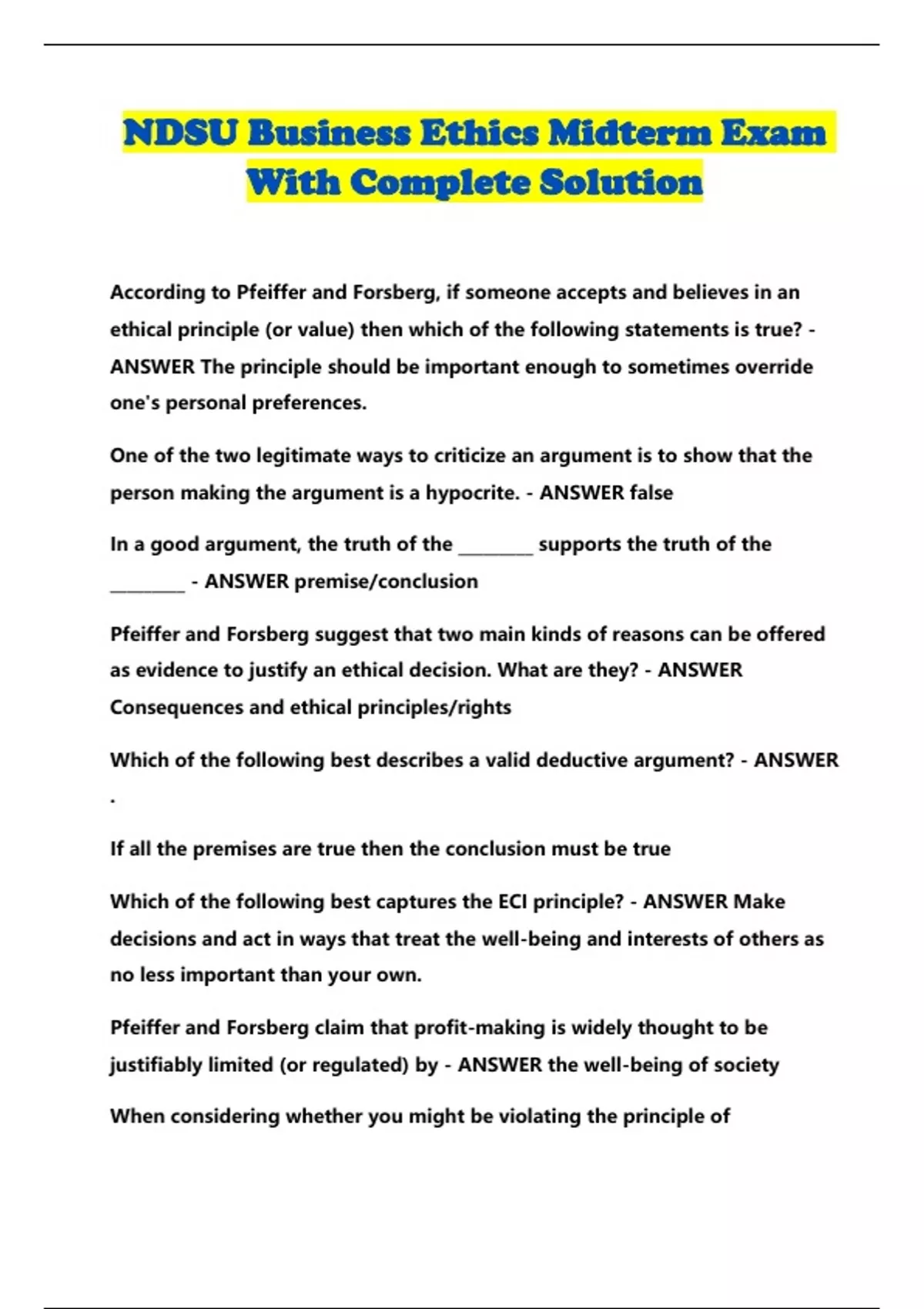 NDSU Business Ethics Midterm Exam With Complete Solution...