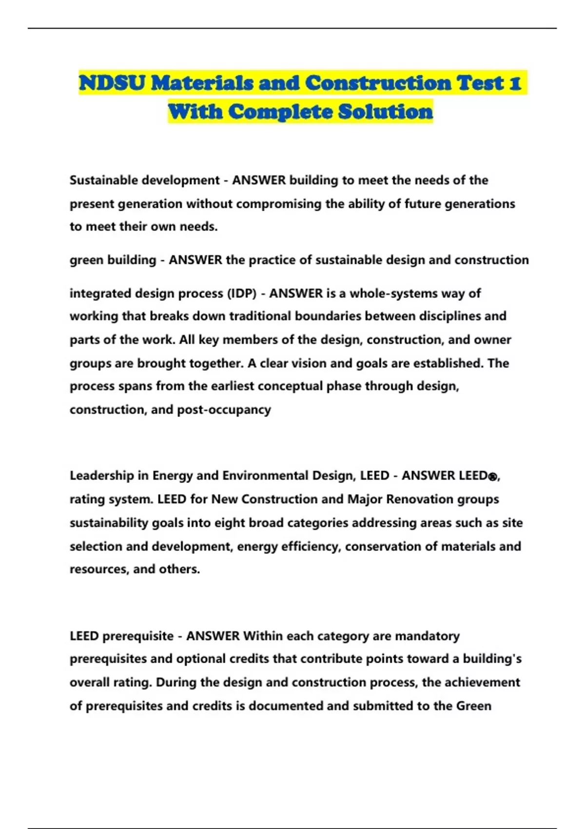 NDSU Materials and Construction Test 1 With Complete Solution...