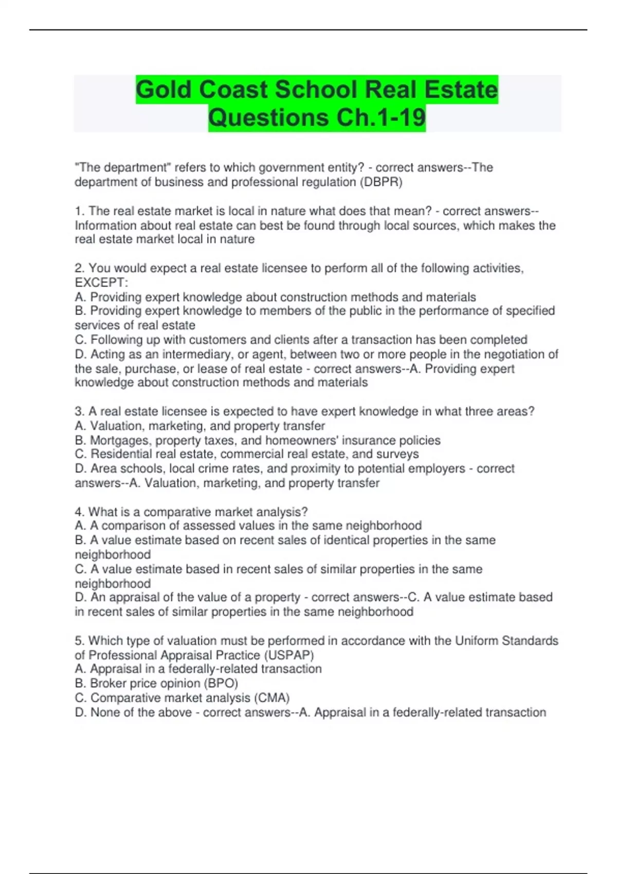 The department" refers to which government entity? - correct answers--The department of business and professional regulation (DBPR) 1. The real estate market is local in nature what does that mean? - correct answers-- Information about real estate can best be found through local sources, which makes the real estate market local in nature 2. You would expect a real estate licensee to perform all of the following activities, EXCEPT: A. Providing expert knowledge about construction methods and materials B. Providing expert knowledge to members of the public in the performance of specified services of real estate C. Following up with customers and clients after a transaction has been completed D. Acting as an intermediary, or agent, between two or more people in the negotiation of the sale, purchase, or lease of real estate - correct answers--A. Providing expert knowledge about construction methods and materials 3. A real estate licensee is expected to have expert knowledge in what three areas? A. Valuation, marketing, and property transfer B. Mortgages, property taxes, and homeowners' insurance policies C. Residential real estate, commercial real estate, and surveys D. Area schools, local crime rates, and proximity to potential employers - correct answers--A. Valuation, marketing, and property transfer