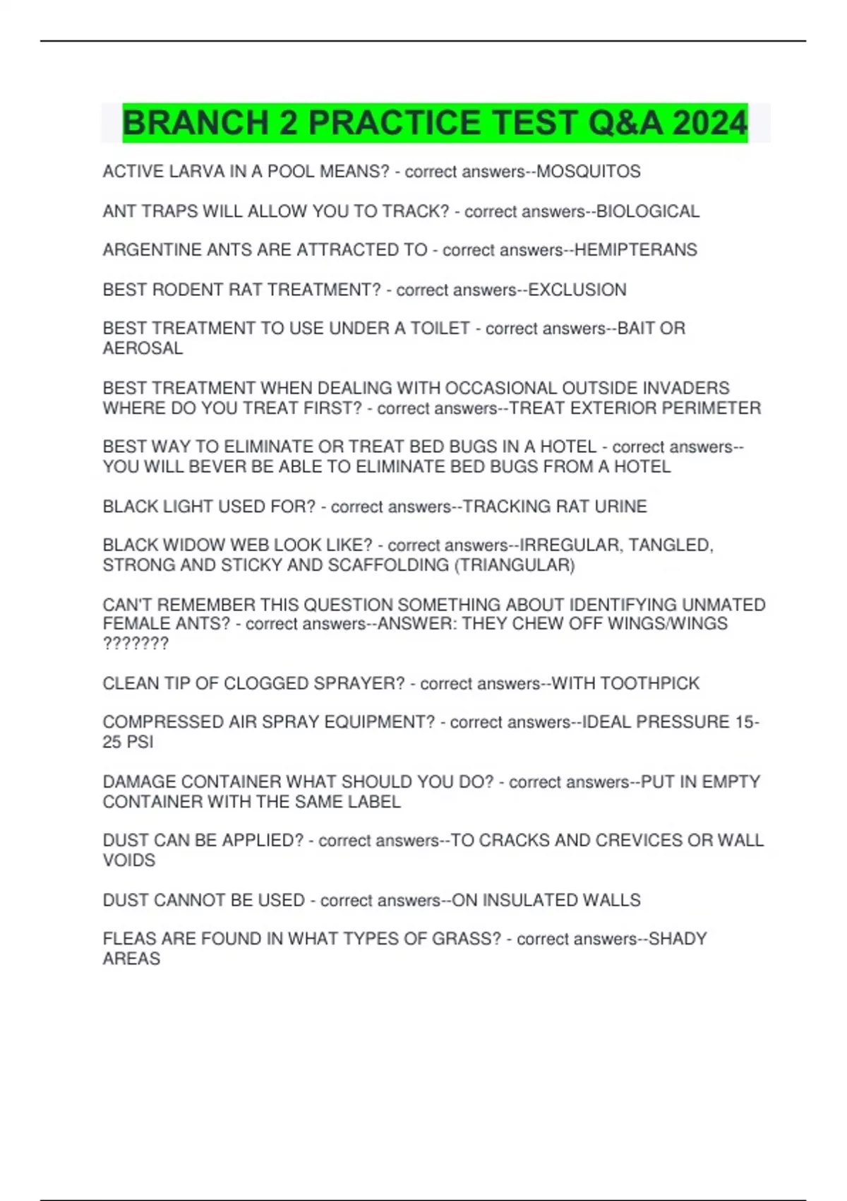 ACTIVE LARVA IN A POOL MEANS? - correct answers--MOSQUITOS ANT TRAPS WILL ALLOW YOU TO TRACK? - correct answers--BIOLOGICAL ARGENTINE ANTS ARE ATTRACTED TO - correct answers--HEMIPTERANS BEST RODENT RAT TREATMENT? - correct answers--EXCLUSION BEST TREATMENT TO USE UNDER A TOILET - correct answers--BAIT OR AEROSAL BEST TREATMENT WHEN DEALING WITH OCCASIONAL OUTSIDE INVADERS WHERE DO YOU TREAT FIRST? - correct answers--TREAT EXTERIOR PERIMETER BEST WAY TO ELIMINATE OR TREAT BED BUGS IN A HOTEL - correct answers-- YOU WILL BEVER BE ABLE TO ELIMINATE BED BUGS FROM A HOTEL BLACK LIGHT USED FOR? - correct answers--TRACKING RAT URINE BLACK WIDOW WEB LOOK LIKE? - correct answers--IRREGULAR, TANGLED, STRONG AND STICKY AND SCAFFOLDING (TRIANGULAR) CAN'T REMEMBER THIS QUESTION SOMETHING ABOUT IDENTIFYING UNMATED FEMALE ANTS? - correct answers--ANSWER: THEY CHEW OFF WINGS/WINGS ???????