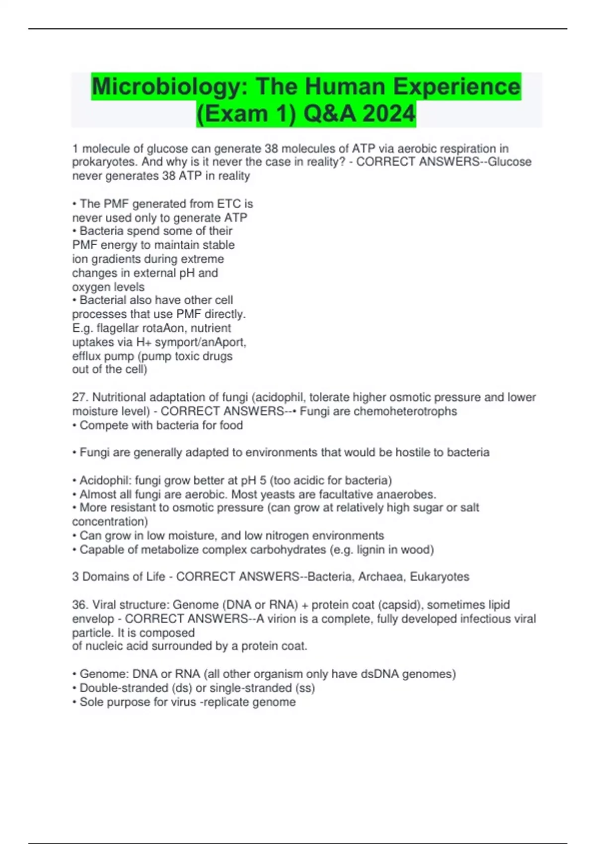 1 molecule of glucose can generate 38 molecules of ATP via aerobic respiration in prokaryotes. And why is it never the case in reality? - CORRECT ANSWERS--Glucose never generates 38 ATP in reality • The PMF generated from ETC is never used only to generate ATP • Bacteria spend some of their PMF energy to maintain stable ion gradients during extreme changes in external pH and oxygen levels • Bacterial also have other cell processes that use PMF directly. E.g. flagellar rotaAon, nutrient uptakes via H+ symport/anAport, efflux pump (pump toxic drugs out of the cell) 27. Nutritional adaptation of fungi (acidophil, tolerate higher osmotic pressure and lower moisture level) - CORRECT ANSWERS--• Fungi are chemoheterotrophs • Compete with bacteria for food