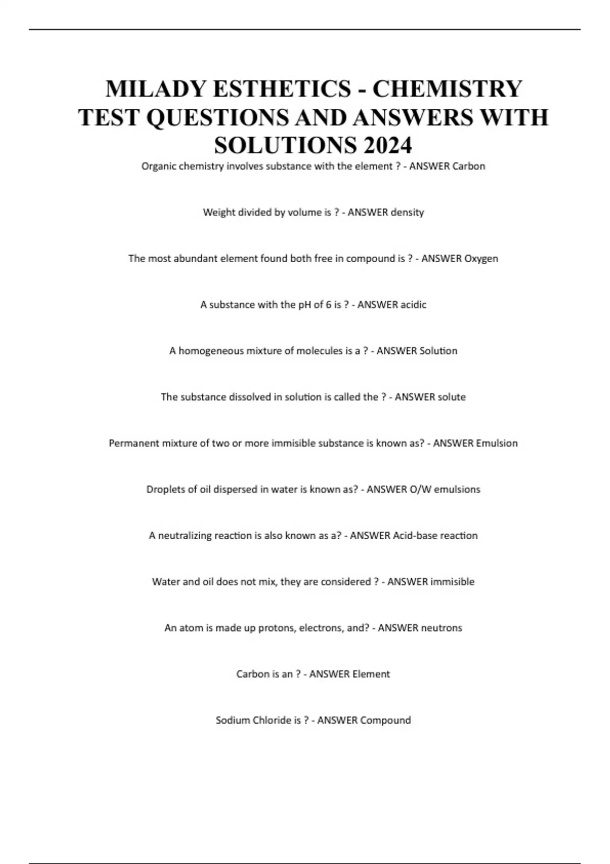 MILADY ESTHETICS - CHEMISTRY TEST QUESTIONS AND ANSWERS WITH SOLUTIONS 2024