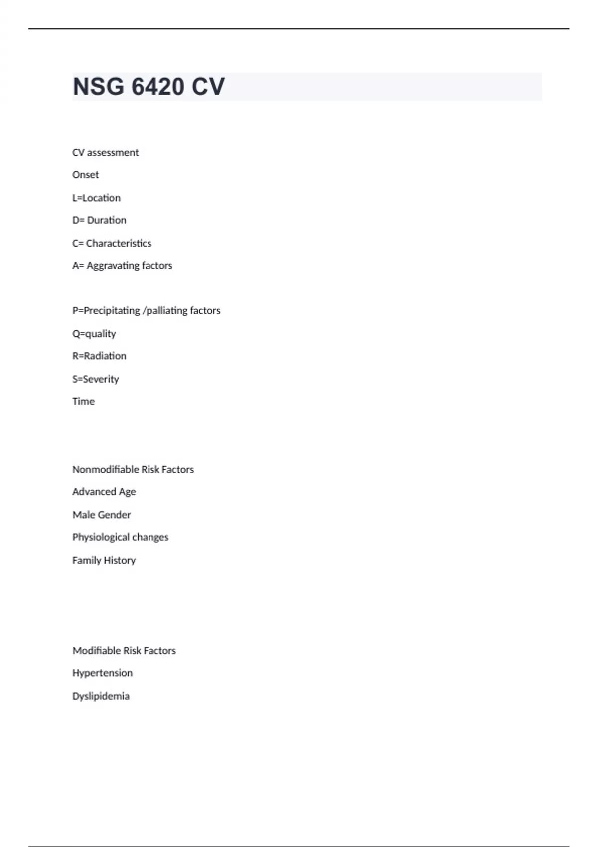 NSG 6420 CV question with 100% correct answers