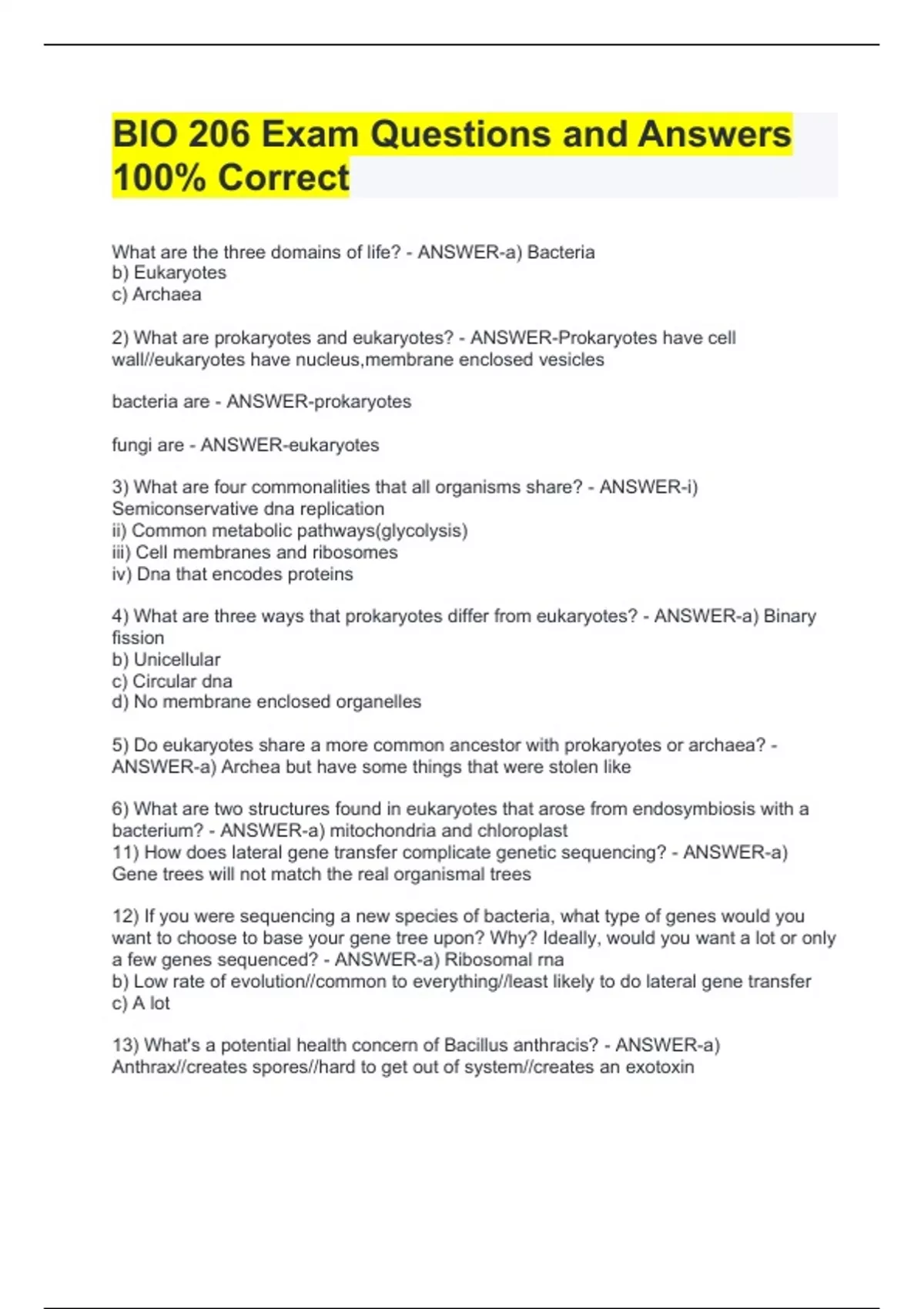 BIO 206 Exam Questions and Answers 100% CorrectBIO 206 Exam Questions and Answers 100% CorrectBIO 206 Exam Questions and Answers 100% CorrectBIO 206 Exam Questions and Answers 100% CorrectBIO 206 Exam Questions and Answers 100% CorrectWhat are the three domains of life? - ANSWER-a) Bacteria b) Eukaryotes c) Archaea 2) What are prokaryotes and eukaryotes? - ANSWER-Prokaryotes have cell wall//eukaryotes have nucleus,membrane enclosed vesicles bacteria are - ANSWER-prokaryotes fungi are - ANSWER-eukaryotes 3) What are four commonalities that all organisms share? - ANSWER-i)