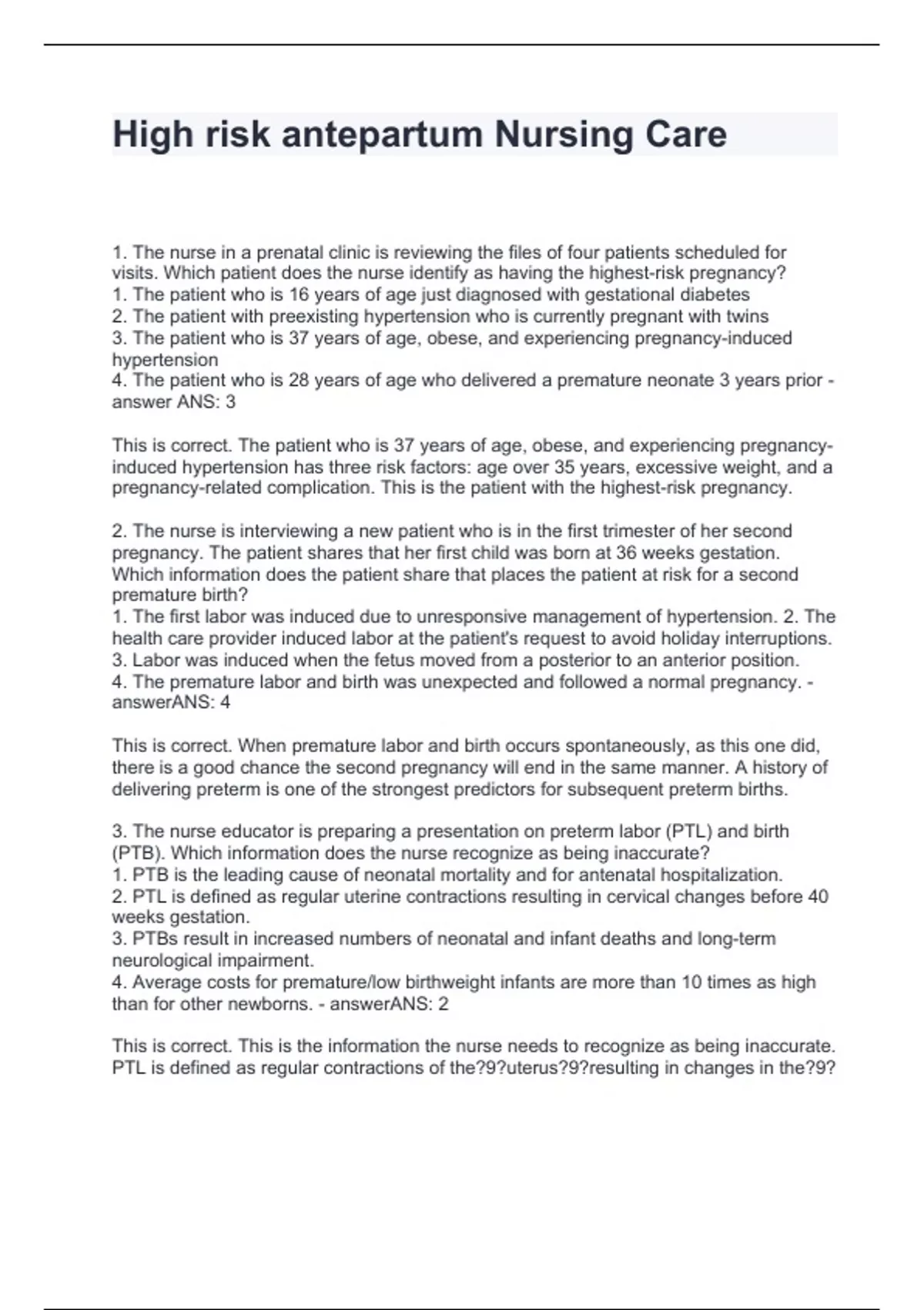 High risk antepartum Nursing Care Questions with correct Answers 2024