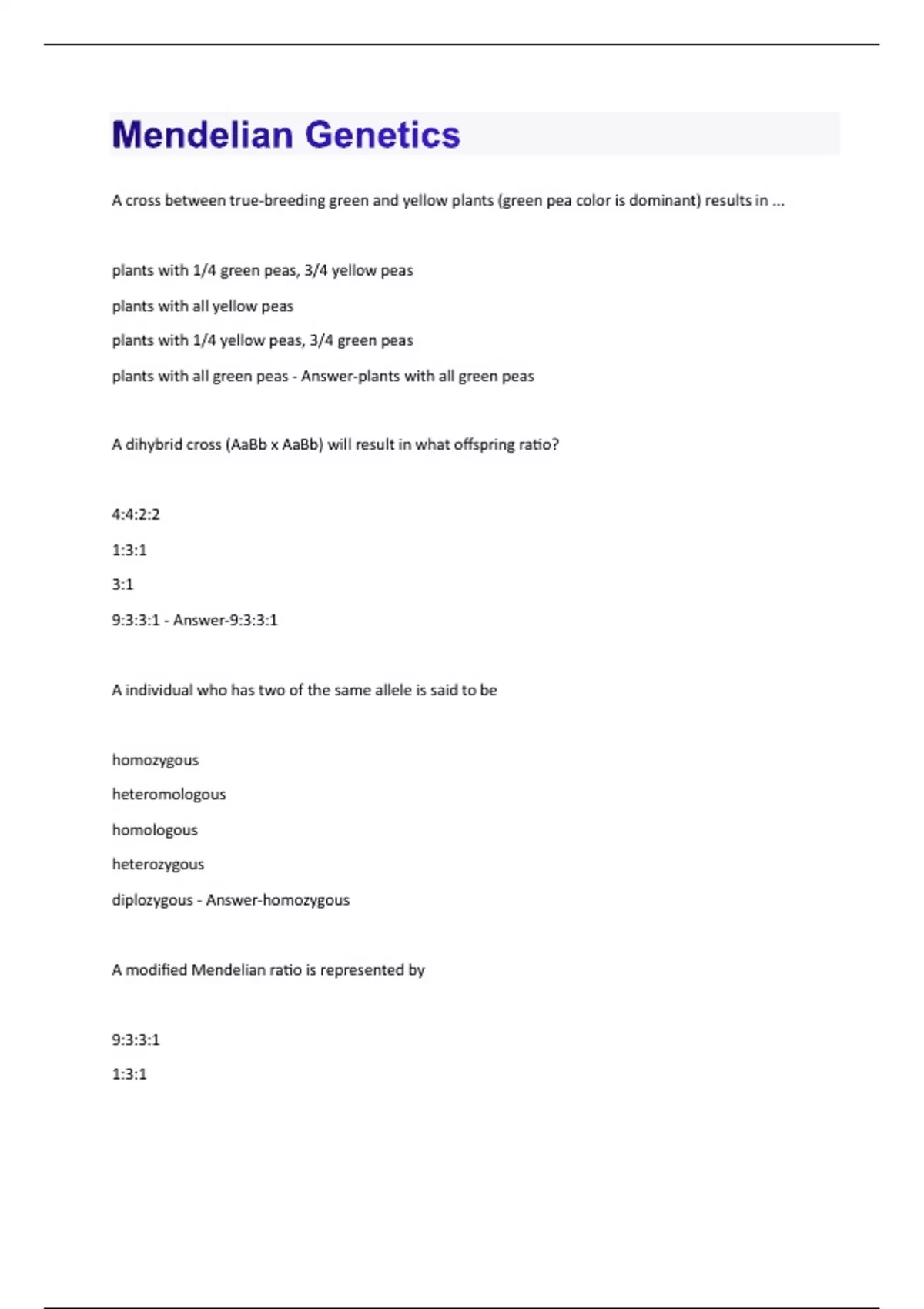 A cross between true-breeding green and yellow plants (green pea color is dominant) results in ... plants with 1/4 green peas, 3/4 yellow peas plants with all yellow peas plants with 1/4 yellow peas, 3/4 green peas plants with all green peas - Answer-plants with all green peas A dihybrid cross (AaBb x AaBb) will result in what offspring ratio? 4:4:2:2 1:3:1 3:1 9:3:3:1 - Answer-9:3:3:1 A individual who has two of the same allele is said to be homozygous heteromologous homologous heterozygous diplozygous - Answer-homozygous A modified Mendelian ratio is represented by 9:3:3:1 1:3:13:1 9:7 1:1 - Answer-9:7 A plant that has purple flowers is crossed with one that has white flowers. The offspring were half white and half purple. What were the genotypes of the parents? Pp x pp Pp x Pp PP x pp PP x WW - Answer-Pp x pp Advantages to using the garden pea for Mendel's experiments included all listed below except true-breeding varieties were scarce. he could expect to observe segregation of traits among the offspring. they have relatively short generation time. sex organs of the pea are enclosed within the flower. - Answer-true-breeding varieties were scarce. An organism that has two different alleles for a single trait is said to be _____ for that trait. haploid heterozygous homozygous polyploid - Answer-heterozygous An organism's expressed physical traits, such as hair color or shape, are called its ____ . genotypeallele phenotype gamete - Answer-phenotype Compared to previous geneticists, the unique characteristic of Mendel's work was keeping records of numbers of different progeny choosing the garden pea for his experiment producing hybrids studying more than one generation crossing true-breeding plants - Answer-keeping records of numbers of different progeny Epistasis is a genetic condition in which certain alleles of one locus can alter the expression of alleles of a different locus. True False - Answer-True Hypertrichosis, hairiness of the pinna of the ear, is inherited as a Y-linked recessive in humans. If a man with hypertrichosis marries a normal woman, what types of children may they have? All of their children of both sexes have hypertrichosis. All the sons have hypertrichosis, but none of their daughters. Half of their sons, but none of their daughters will have hypertrichosis. All the daughters have hypertrichosis, but none of their sons. None of their children have hypertrichosis. - Answer-All the sons have hypertrichosis, but none of their daughters. If a man has blood type O and his wife has blood type AB, what blood types are possible among their children?A only B only A and B O only - Answer-A and B
