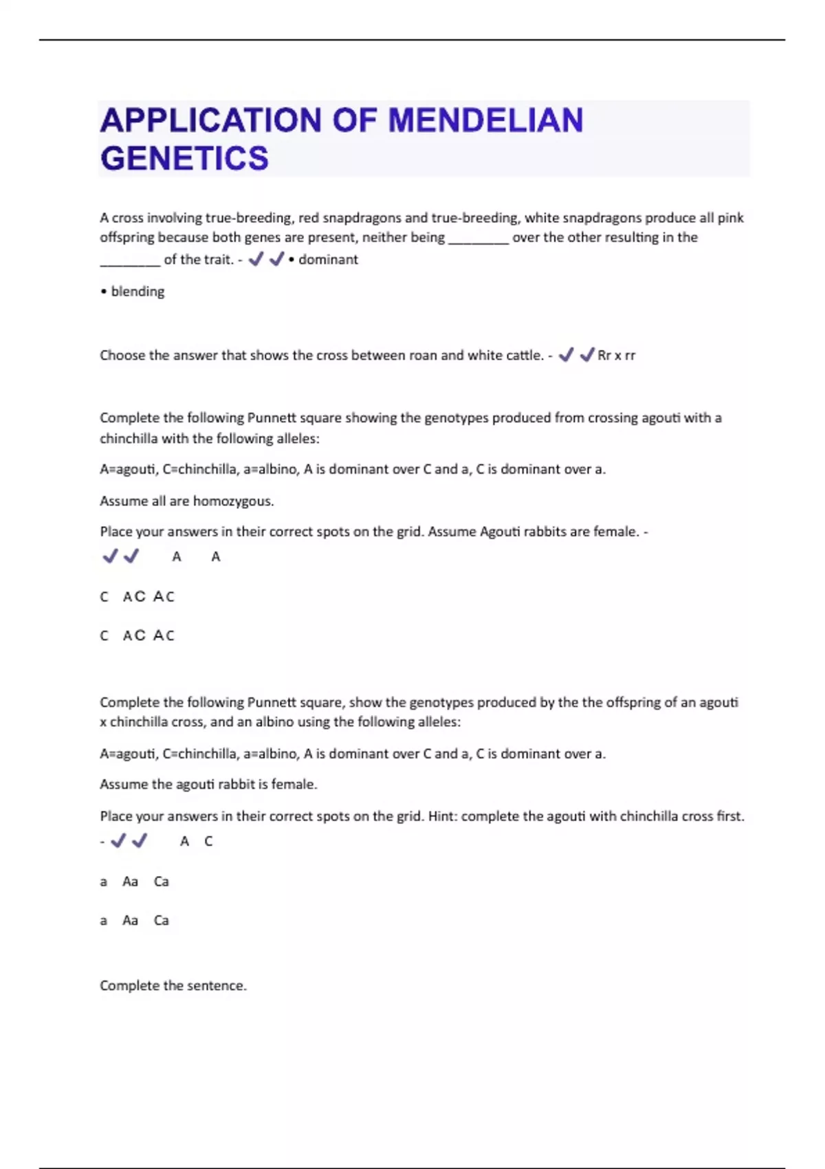 A cross involving true-breeding, red snapdragons and true-breeding, white snapdragons produce all pink offspring because both genes are present, neither being ________ over the other resulting in the ________ of the trait. - • dominant • blending Choose the answer that shows the cross between roan and white cattle. - Rr x rr Complete the following Punnett square showing the genotypes produced from crossing agouti with a chinchilla with the following alleles: A=agouti, C=chinchilla, a=albino, A is dominant over C and a, C is dominant over a. Assume all are homozygous. Place your answers in their correct spots on the grid. Assume Agouti rabbits are female. - ㅤㅤAㅤㅤA CㅤAC A C CㅤAC A C Complete the following Punnett square, show the genotypes produced by the the offspring of an agouti x chinchilla cross, and an albino using the following alleles: A=agouti, C=chinchilla, a=albino, A is dominant over C and a, C is dominant over a. Assume the agouti rabbit is female. Place your answers in their correct spots on the grid. Hint: complete the agouti with chinchilla cross first. - ㅤㅤAㅤC aㅤAaㅤCa aㅤAaㅤCa Complete the sentence.In a cross between roan and white cattle, Rr x rr, the offspring will be - ½ Rr, ½ rr Cross a chinchilla with an albino. Complete the Punnett square to show the genotypes from this cross. Assume the chinchilla rabbits are female. - ㅤㅤCㅤa aㅤCaㅤaa aㅤCaㅤaa Cross a homozygous agouti rabbit with a chinchilla assuming the following alleles: A=agouti, C=chinchilla, a=albino, A is dominant over C and a, C is dominant over a. Assume agouti rabbits are female. Indicate the phenotypic ratio of crossing the offspring of the agouti with an albino. - ½ agouti, ½ chinchilla Cross an agouti rabbit with a chinchilla, using the following alleles: A=agouti, C=chinchilla, a=albino, A is dominant over C and a, C is dominant over a. Then using one of those offspring, complete a cross with an albino. Indicate the phenotypic ratios. Assume the agouti rabbit is female. - ½ chinchilla, ½ albino Give an example of how you could determine whether or not a trait was displaying incomplete dominance. What would you do? What would your results have to be for the trait to be incomplete dominant? - The f₁ generation would show a mix of dominant traits. And the f₂ generation would show both parent traits as well as the blended traits. Heterozygous genes will always display a dominant trait - False How many combinations of genotypes are possible for the coat coloration of rabbits which is governed by three alleles? - 6 If you first cross an agouti rabbit with a chinchilla, and then continue to cross each subsequent generation with albinos, what will occur in the growing population? - the percentage of albinos will increaseIndicate the coat color and the proportion of offspring with that color for each of the following crosses of rabbits. Assume all are homozygous. agouti x agouti - all agouti Indicate the coat color and the proportion of offspring with that color for each of the following crosses of rabbits. Assume all are homozygous. agouti x albino - all agouti Indicate the coat color and the proportion of offspring with that color for each of the following crosses of rabbits. Assume all are homozygous. albino x albino - all albino Indicate the coat color and the proportion of offspring with that color for each of the following crosses of rabbits. Assume all are homozygous. chinchilla x albino - all chinchilla Indicate the coat color and the proportion of offspring with that color for each of the following crosses of rabbits. Assume all are homozygous. chinchilla x chinchilla - all chinchilla