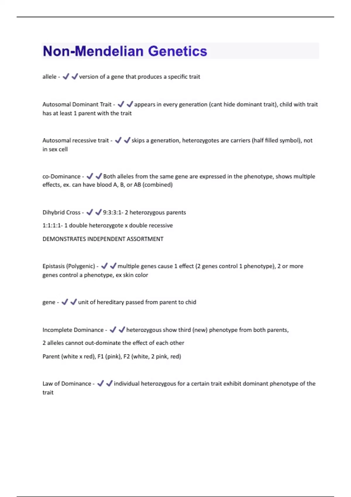 allele - version of a gene that produces a specific trait Autosomal Dominant Trait - appears in every generation (cant hide dominant trait), child with trait has at least 1 parent with the trait Autosomal recessive trait - skips a generation, heterozygotes are carriers (half filled symbol), not in sex cell co-Dominance - Both alleles from the same gene are expressed in the phenotype, shows multiple effects, ex. can have blood A, B, or AB (combined) Dihybrid Cross - 9:3:3:1- 2 heterozygous parents 1:1:1:1- 1 double heterozygote x double recessive DEMONSTRATES INDEPENDENT ASSORTMENT Epistasis (Polygenic) - multiple genes cause 1 effect (2 genes control 1 phenotype), 2 or more genes control a phenotype, ex skin color gene - unit of hereditary passed from parent to chid Incomplete Dominance - heterozygous show third (new) phenotype from both parents, 2 alleles cannot out-dominate the effect of each other Parent (white x red), F1 (pink), F2 (white, 2 pink, red) Law of Dominance - individual heterozygous for a certain trait exhibit dominant phenotype of the traitLaw of Independent Assortment - each pair of alleles segregate to gametes independent of the other pairs that are in the same chromosomes Law of Segregation - alleles are packed to separate gametes (during meiosis) Linkage - 2 genes found on same chromosome Monohybrid Cross - 3:1- 2 heterozygous parents 1:2:1- 2 heterozygous parents 1:1: 1 heterozygote x recessive parent Multiple Allelism - Multiple alleles of a gene exist in a population Pleiotropy - One gene influences 2 or more unrelated phenotypic traits, ex. chickens have the dominant allele for feathers which influence their body temperature polymorphism - in a population, 2 or more phenotypes are present Principle of segregation - properties of an allele dont influence which gamete that allele will be in Sex linked recessive trait - can be recessive or dominant, X-LINKED, inherited from mom, easier for boys to get a sex linked trait because they only have one X Test Cross - Crossing an organism of unknown genotype with another with recessive traits will determine genotype of the unknown parent Trait - variant of a character