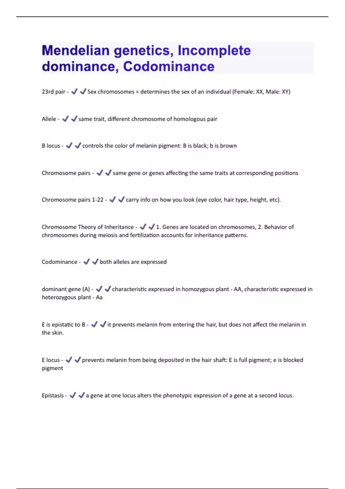 23rd pair - Sex chromosomes = determines the sex of an individual (Female: XX, Male: XY) Allele - same trait, different chromosome of homologous pair B locus - controls the color of melanin pigment: B is black; b is brown Chromosome pairs - same gene or genes affecting the same traits at corresponding positions Chromosome pairs 1-22 - carry info on how you look (eye color, hair type, height, etc). Chromosome Theory of Inheritance - 1. Genes are located on chromosomes, 2. Behavior of chromosomes during meiosis and fertilization accounts for inheritance patterns. Codominance - both alleles are expressed dominant gene (A) - characteristic expressed in homozygous plant - AA, characteristic expressed in heterozygous plant - Aa E is epistatic to B - it prevents melanin from entering the hair, but does not affect the melanin in the skin. E locus - prevents melanin from being deposited in the hair shaft: E is full pigment; e is blocked pigment Epistasis - a gene at one locus alters the phenotypic expression of a gene at a second - sequence of dna/rna genetics - study of biological inheritance patterns and variation genotype - genetic instructions Gregor Mendel () - Austrian monk father of genetics research re-discovered after his death pea plants for his research
