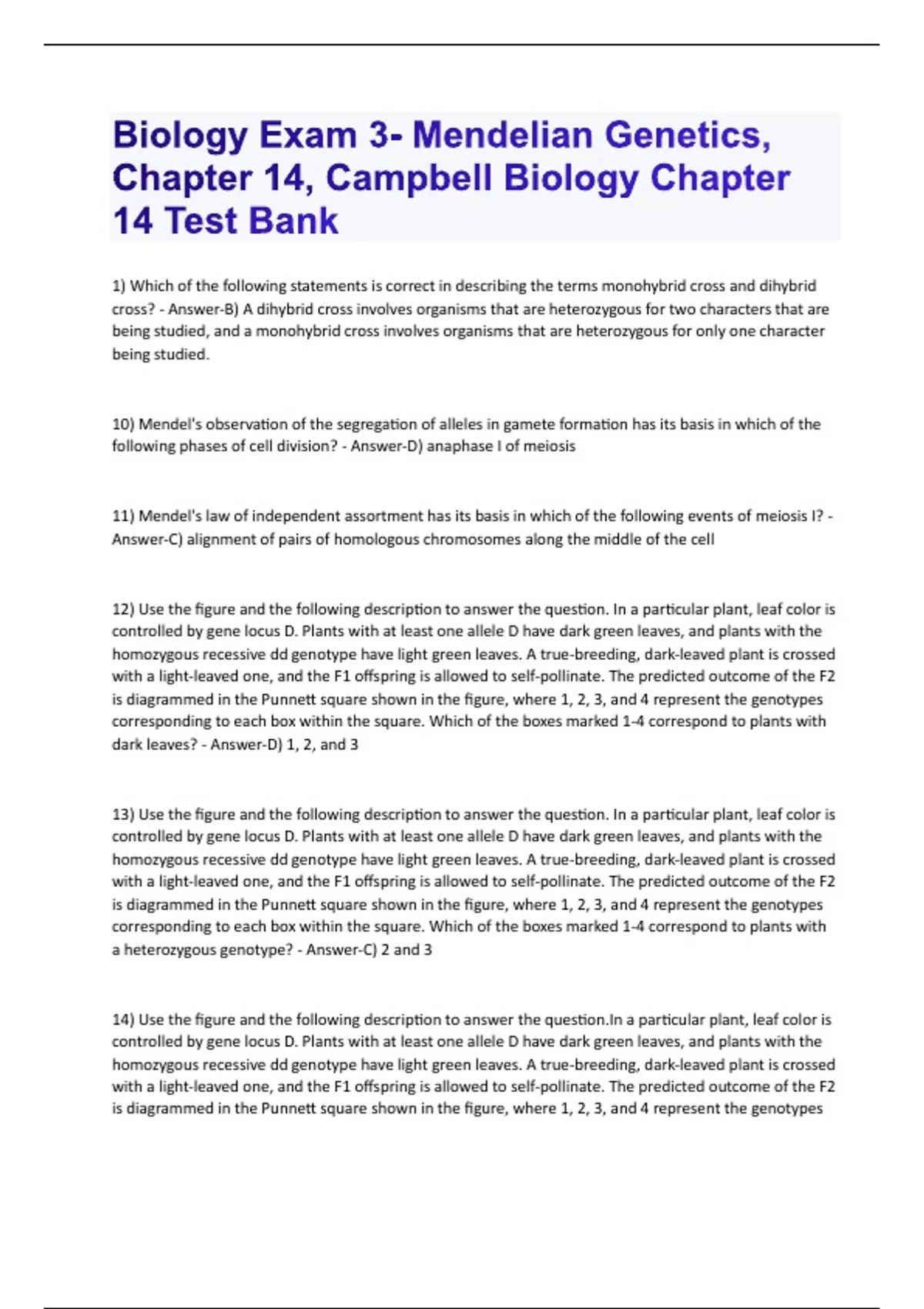 Biology Exam 3- Mendelian Genetics, Chapter 14, Campbell Biology Chapter 14 Test Bank Questions With 100 % Correct Answers | latest