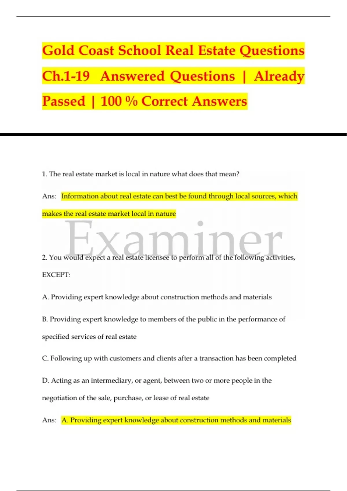 1. The real estate market is local in nature what does that mean? Ans: Information about real estate can best be found through local sources, which makes the real estate market local in nature 2. You would expect a real estate licensee to perform all of the following activities, EXCEPT: A. Providing expert knowledge about construction methods and materials B. Providing expert knowledge to members of the public in the performance of specified services of real estate C. Following up with customers and clients after a transaction has been completed D. Acting as an intermediary, or agent, between two or more people in the negotiation of the sale, purchase, or lease of real estate Ans: A. Providing expert knowledge about construction methods and materials 3. A real estate licensee is expected to have expert knowledge in what three areas? A. Valuation, marketing, and property transfer B. Mortgages, property taxes, and homeowners' insurance policies C. Residential real estate, commercial real estate, and surveys D. Area schools, local crime rates, and proximity to potential employers Ans: A. Valuation, marketing, and property transfer 4. What is a comparative market analysis? A. A comparison of assessed values in the same neighborhood B. A value estimate based on recent sales of identical properties in the same neighborhood C. A value estimate based in recent sales of similar properties in the same neighborhood D. An appraisal of the value of a property Ans: C. A value estimate based in recent sales of similar properties in the same neighborhood 5. Which type of valuation must be performed in accordance with the Uniform Standards of Professional Appraisal Practice (USPAP) A. Appraisal in a federally-related transaction B. Broker price opinion (BPO) C. Comparative market analysis (CMA) D. None of the above Ans: A. Appraisal in a federally-related transaction 6. Many real estate licensees engage in "farming". Which of the following best describes what that means? A. They conduct open houses on weekends B. They use marketing vehicles such as direct mailing and advertisements in real estate magazines C. They concentrate on the sale of agricultural properties D. They concentrate on one type of property or in a particular neighborhood Ans: D. They concentrate on one type of property or in a particular neighborhood All of the following would be considered commercial property, EXCEPT A. an office building that accommodates three tenants B. A high-rise apartment building in the downtown area of the city C. A shopping center that adjoins a residential neighborhood D. A large house that has been subdivide