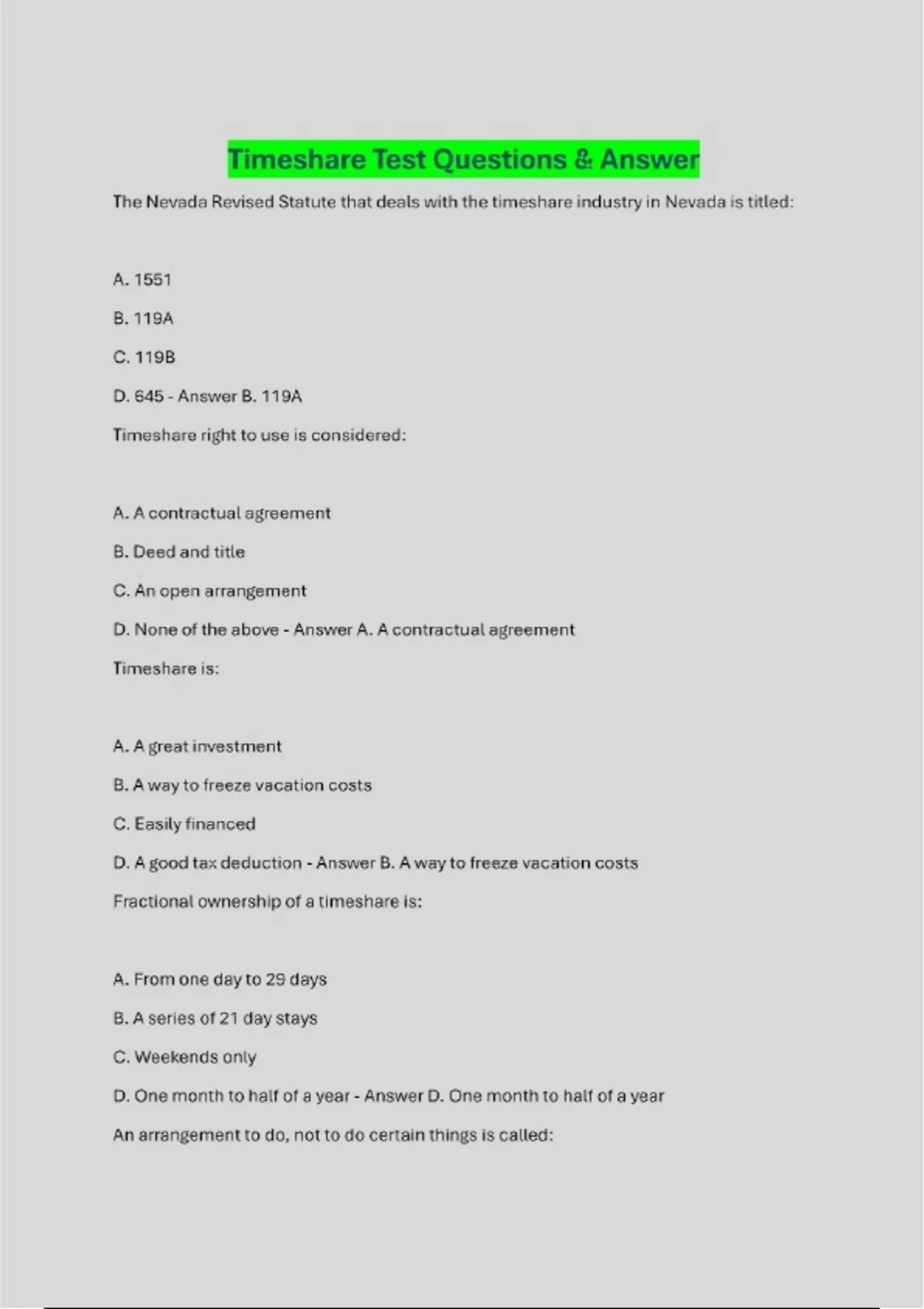 The Nevada Revised Statute that deals with the timeshare industry in Nevada is titled: A. 1551 B. 119A C. 119B D. 645 - Answer B. 119A Timeshare right to use is considered: A. A contractual agreement B. Deed and title C. An open arrangement D. None of the above - Answer A. A contractual agreement Timeshare is: A. A great investment B. A way to freeze vacation costs C. Easily financed D. A good tax deduction - Answer B. A way to freeze vacation costs Fractional ownership of a timeshare is: A. From one day to 29 days B. A series of 21 day stays C. Weekends only D. One month to half of a year - Answer D. One month to half of a year An arrangement to do, not to do certain things is called: