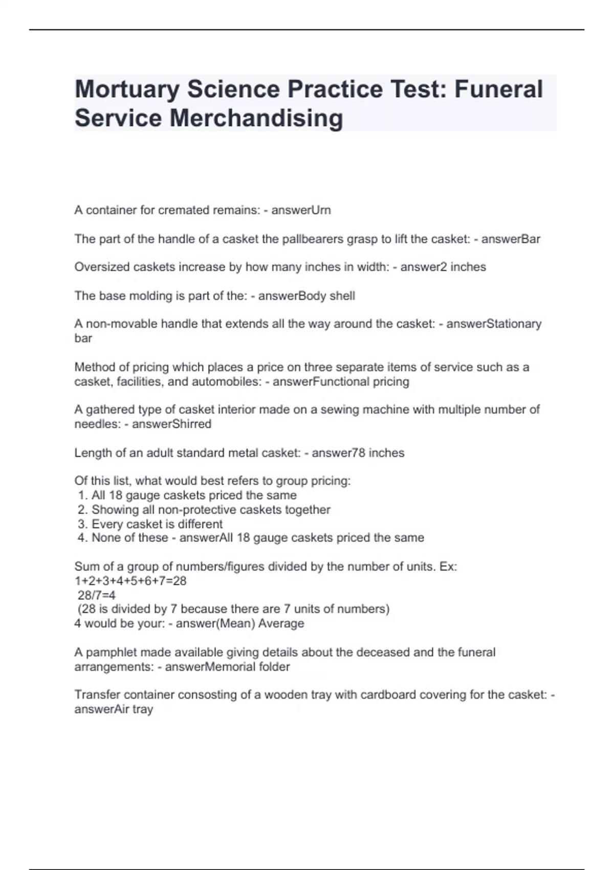 Mortuary Science Practice Test: Funeral Service Merchandising Questions and Answers