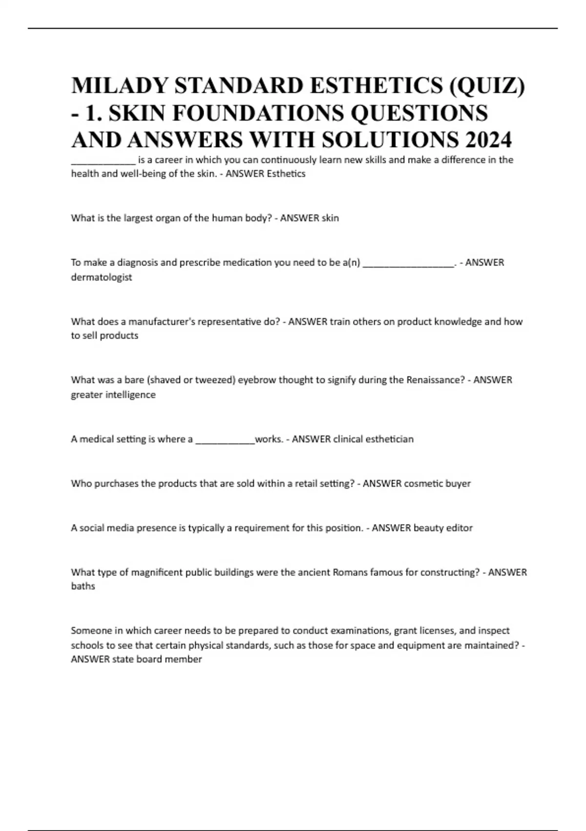 MILADY STANDARD ESTHETICS (QUIZ) - 1. SKIN FOUNDATIONS QUESTIONS AND ANSWERS WITH SOLUTIONS 2024