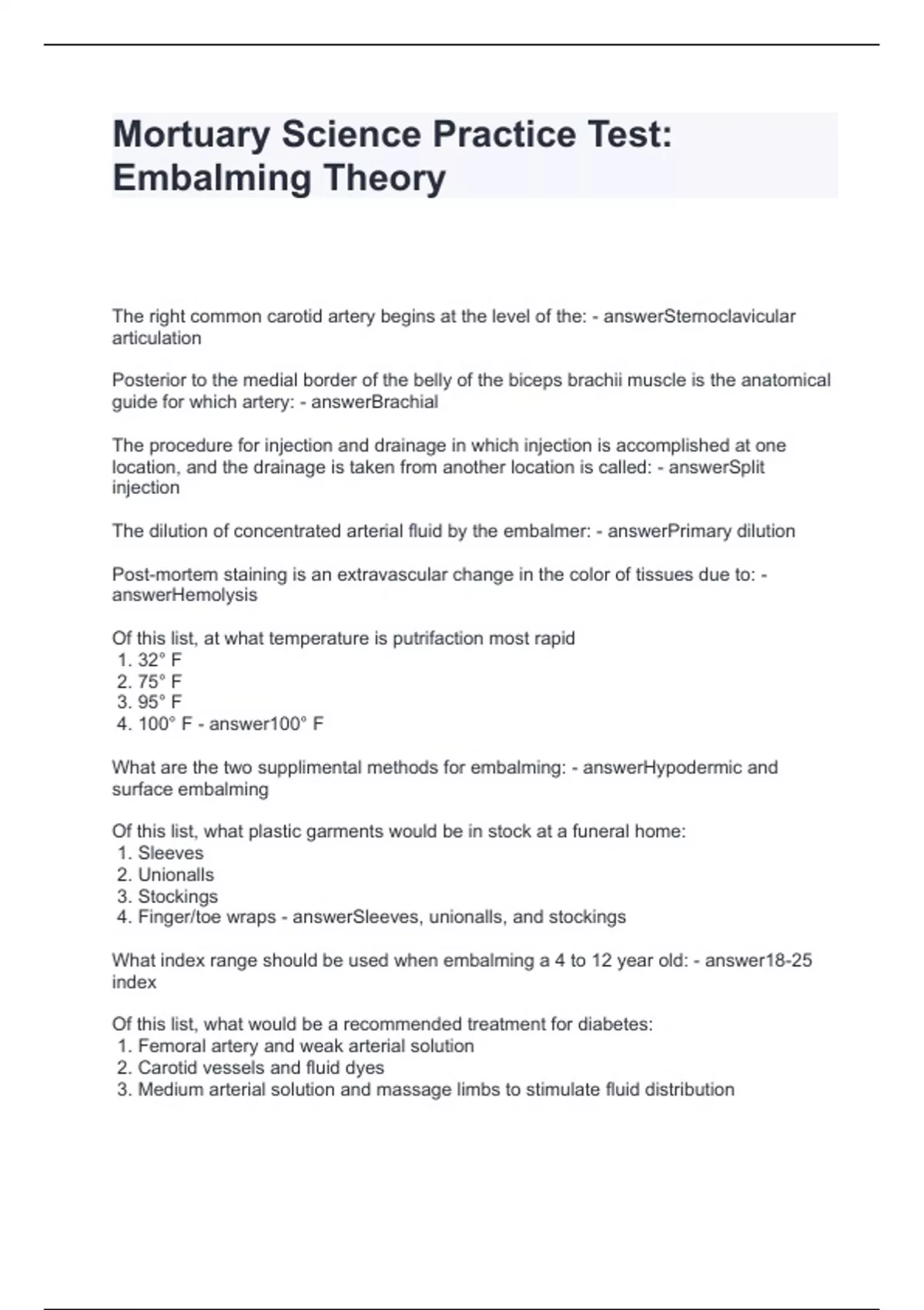 Mortuary Science Practice Test: Embalming Theory Questions with correct Answers