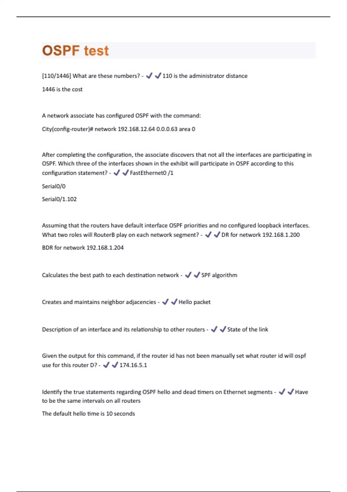 [110/1446] What are these numbers? - 110 is the administrator distance 1446 is the cost A network associate has configured OSPF with the command: City(config-router)# network 192.168.12.64 0.0.0.63 area 0 After completing the configuration, the associate discovers that not all the interfaces are participating in OSPF. Which three of the interfaces shown in the exhibit will participate in OSPF according to this configuration statement? - FastEthernet0 /1 Serial0/0 Serial0/1.102 Assuming that the routers have default interface OSPF priorities and no configured loopback interfaces. What two roles will RouterB play on each network segment? - DR for network 192.168.1.200 BDR for network 192.168.1.204 Calculates the best path to each destination network - SPF algorithm Creates and maintains neighbor adjacencies - Hello packet Description of an interface and its relationship to other routers - State of the link Given the output for this command, if the router id has not been manually set what router id will ospf use for this router D? - 174.16.5.1 Identify the true statements regarding OSPF hello and dead timers on Ethernet segments - Have to be the same intervals on all routers The default hello time is 10 secondsThe default dead time is 40 seconds The dead timer dynamically changes If a Cisco router learns two routes to the same destination, one through OSPF and one through EIGRP, which route will be added to the routing table if default values are used? - EIGRP In a multi area OSPF network an interarea summarized route is configured and advertised from a ____? - ABR OSPF routing uses the concept of areas. What are the characteristics of OSPF areas? - Area 0 is called the backbone area Multiple OSPF areas must connect to area 0 All routers within an area have identical link state databases Router 1 is configure properly for a single area OSPF and router 2 has been recently installed on the network. Which set of commands is required to configure a single area ospf for the networks that are connected to router 2. - Know how to advertise networks Basic configuration of the router Router A is configured for OSPF using those commands. Neighboring router B is to be configured with OSPF. What must be true if the router are to become adjacent? - Router B must use area 0 in its configuration The interfaces of all routers are configured for ospf area 0. Router 3 can ping router 1 but the two routers are unable to establish a neighbor adjacency. What should the network admin do to troubleshoot the problem? - Check the hello and dead intervals between the routers The internetwork infrastructure of company XYZ consist of a single OSPF area as shown in the graphic. There is concern that a lack of router resources is impending internetwork performance. As part of examining the router resources, OSPF designated routers need to be known. All router OSPF priorities are at the default and the router ids are shown with each router. Which routes are likely to have been elected as DR? - Corp 4 Branch 2The routers in the exhibit are using default OSPF configuration settings to advertise all attached networks. If all of the routers start at the same time, what will be the result of the DR and BDR elections for this single area OSPF network? - Router A will be DR for 10.4.0.0/16 and HQ will be BDR for 10.4.0.0/16 This packet is send when a router notices a change in a link state - LSU This packet is sent by the slave router if the database description has more up to date link state entries - LSR This packet is sent to compare the local topology to that send by another router - DBD Triggered when a topology change has occurred - LSU Two neighboring routers are configured for OSPF but they have different hello and dead intervals. What will happen? - They will fail to become adjacent What are possible reasons R1 can establish an OSPF neighbor relationship with R3, according to the following theoretical graphic? - The hello and dead interval timers are not configured with the same value R1 and R3 have been configured in different areas What command is used to display the contents of the OSPF topological database that provides the router id and process id? - Show ip ospf database Which characteristics are representative of a link state routing protocol? - Used when fast convergence is a priority on the network Provides common view of an entire topology Utilizes event trigger updatesWhich interface configuration command might you use as an alternative to using the bandwidth command and achieve the same goal when implementing OSPF? - Cost Which of the following algorithm does OSPF use to determine the best path? - Dijkstra's algorithm Which of the following statements below best describes the process identifier that's used to run OSPF on a router? - It is locally significant It is needed to identify a unique instance of OSPF Which of the following statements is true in regards to the differences between ospfv2 and v3? - OSPFv3 is configured directly on the interface OSPFv3 uses the link local address as the source address Which two statement describe the use of OSPF DR/BDR elections? - Elections are sometimes required in Non-broadcast multi-access networks Elections take place in broadcast, multi-access networks Which two statements are true about the loopback address that is configured on router B? - It provides stability for the OSPF process on RouterB. It specifies that the router ID for RouterB should be 10.0.0.1. Which type of routing table entry would indicate that an external route was redistributed into the multi area ospf process? - O E2 Why are two OSPF designated routers identified on CORE router? - Core router is connected to more than one multi-access network Why would you use the bandwidth command when configuring an interface where OSPF routing is used? - To ensure that OSPF uses a suitable value when calculating its metric