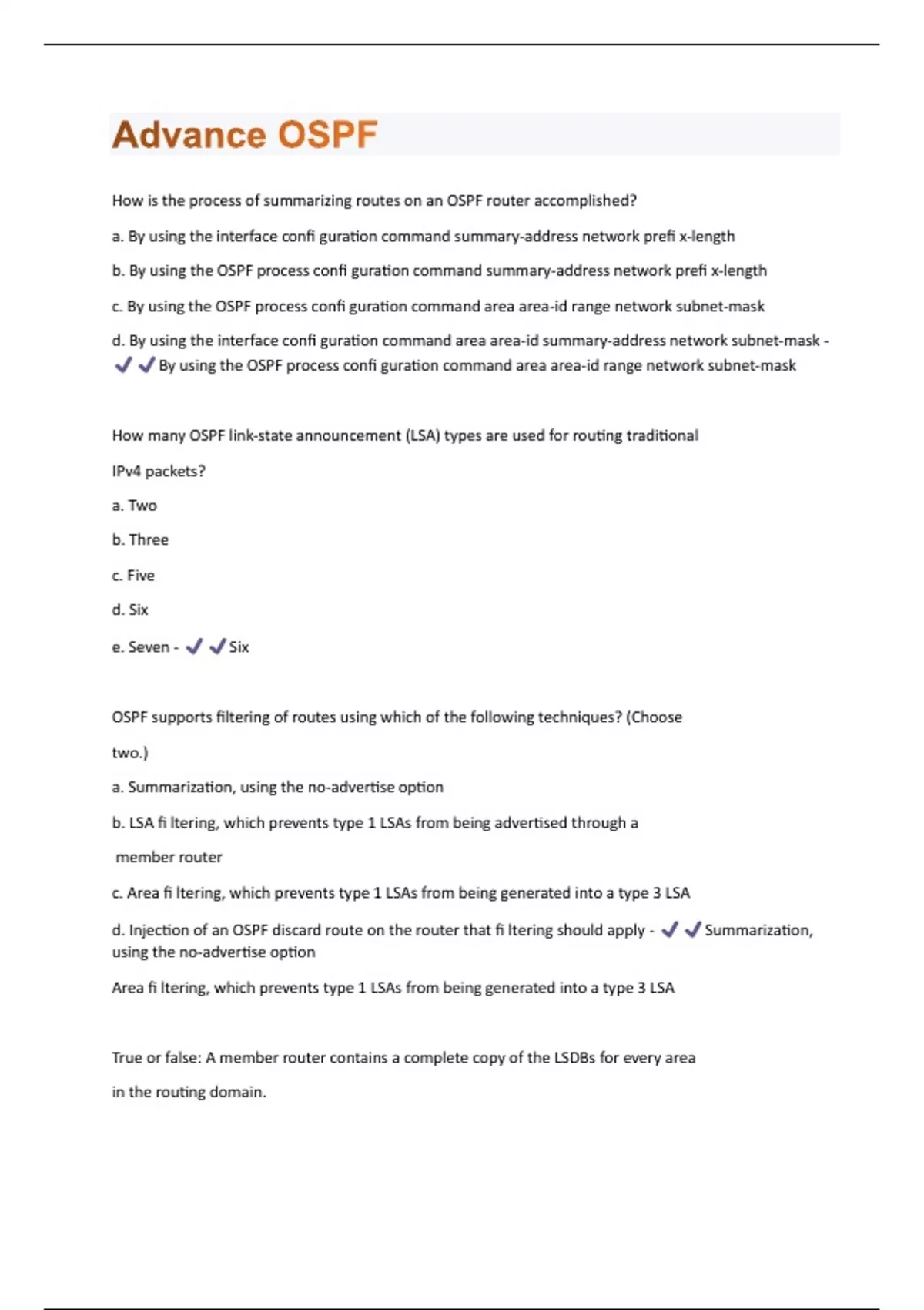 How is the process of summarizing routes on an OSPF router accomplished? a. By using the interface confi guration command summary-address network prefi x-length b. By using the OSPF process confi guration command summary-address network prefi x-length c. By using the OSPF process confi guration command area area-id range network subnet-mask d. By using the interface confi guration command area area-id summary-address network subnet-mask - By using the OSPF process confi guration command area area-id range network subnet-mask How many OSPF link-state announcement (LSA) types are used for routing traditional IPv4 packets? a. Two b. Three c. Five d. Six e. Seven - Six OSPF supports filtering of routes using which of the following techniques? (Choose two.) a. Summarization, using the no-advertise option b. LSA fi ltering, which prevents type 1 LSAs from being advertised through a member router c. Area fi ltering, which prevents type 1 LSAs from being generated into a type 3 LSA d. Injection of an OSPF discard route on the router that fi ltering should apply - Summarization, using the no-advertise option Area fi ltering, which prevents type 1 LSAs from being generated into a type 3 LSA True or false: A member router contains a complete copy of the LSDBs for every area in the routing domain.a. True b. False - False True or false: A router with an interface associated with Area 1 and Area 2 will be able to inject routes learned from one area into another area. a. True b. False - False True or false: Breaking a large OSPF topology into smaller OSPF areas can be considered a form of summarization. a. True b. False - True True or false: OSPF uses the shortest total path metric to identify the best path for every internal OSPF route (intra-area and interarea). a. True b. False - False True or false: When an ABR receives a network LSA, the ABR forwards the network LSA to the other connected areas. a. True b. False - False What is the LSA age field in the LSDB used for? a. For version control—to ensure that the most recent LSA is present b. To age out old LSAs by removing an LSA when its age reaches zero c. For troubleshooting—to identify exactly when the LSA was advertised d. To age out old LSAs by removing an LSA when it reaches 3600 seconds - To age out old LSAs by removing an LSA when it reaches 3600 secondsWhen a type 3 LSA is received in a nonbackbone area, what does the ABR do? a. Discards the type 3 LSA and does not process it b. Installs the type 3 LSA for only the area where it was received c. Advertises the type 3 LSA to the backbone area and displays an error d. Advertises the type 3 LSA to the backbone area - Installs the type 3 LSA for only the area where it was received