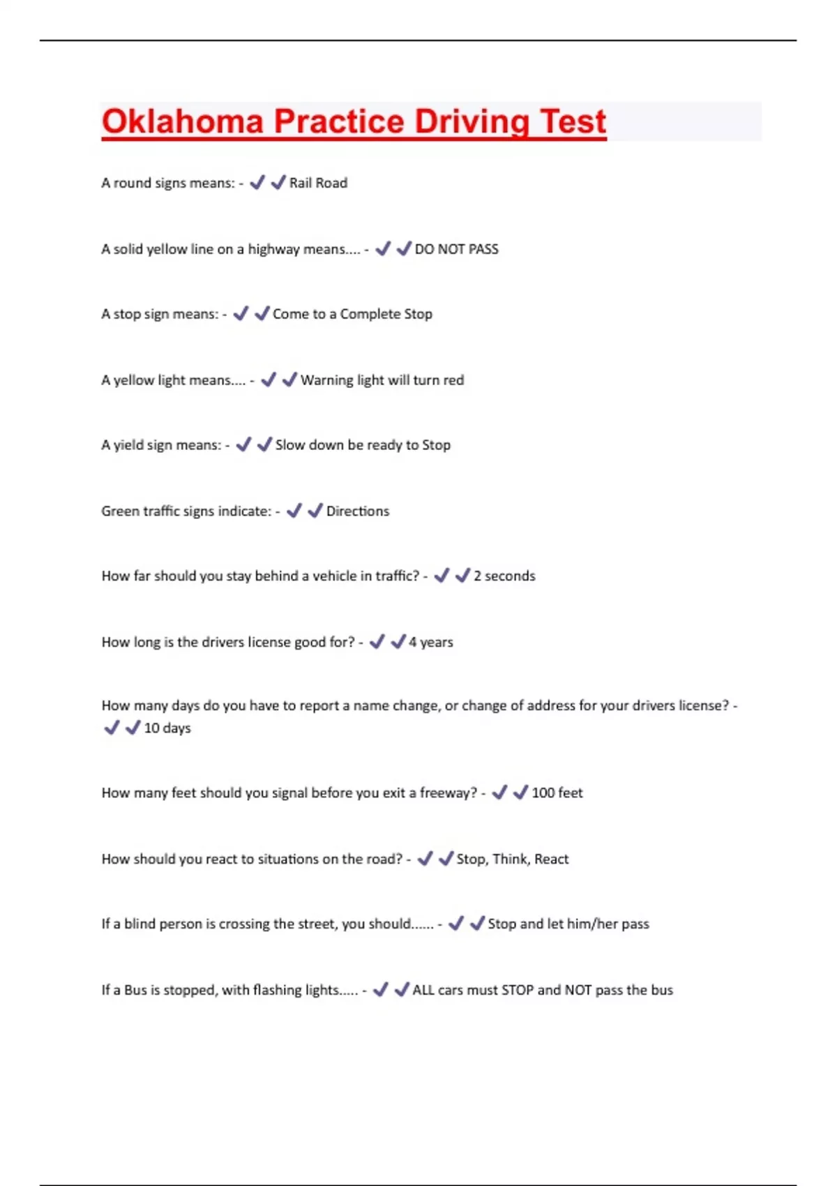 Oklahoma Practice Driving Test Questions + Answers Graded A+