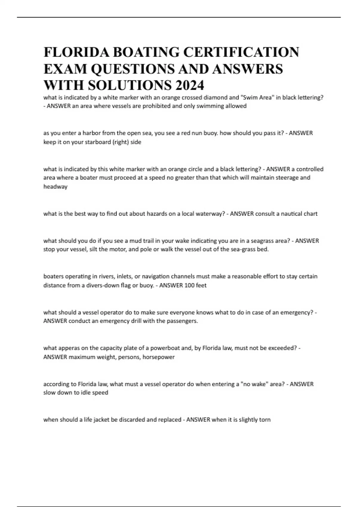 FLORIDA BOATING CERTIFICATION EXAM QUESTIONS AND ANSWERS WITH SOLUTIONS 2024