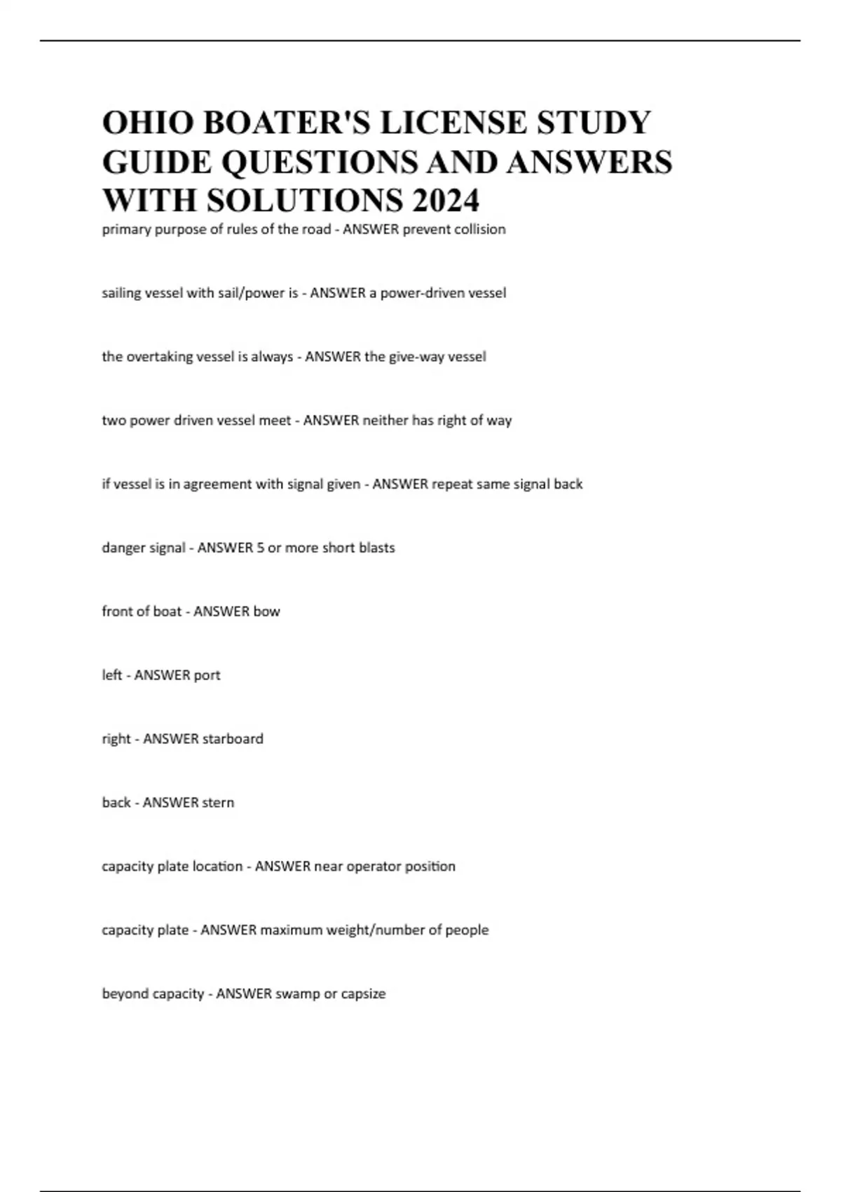 OHIO BOATER'S LICENSE STUDY GUIDE QUESTIONS AND ANSWERS WITH SOLUTIONS 2024