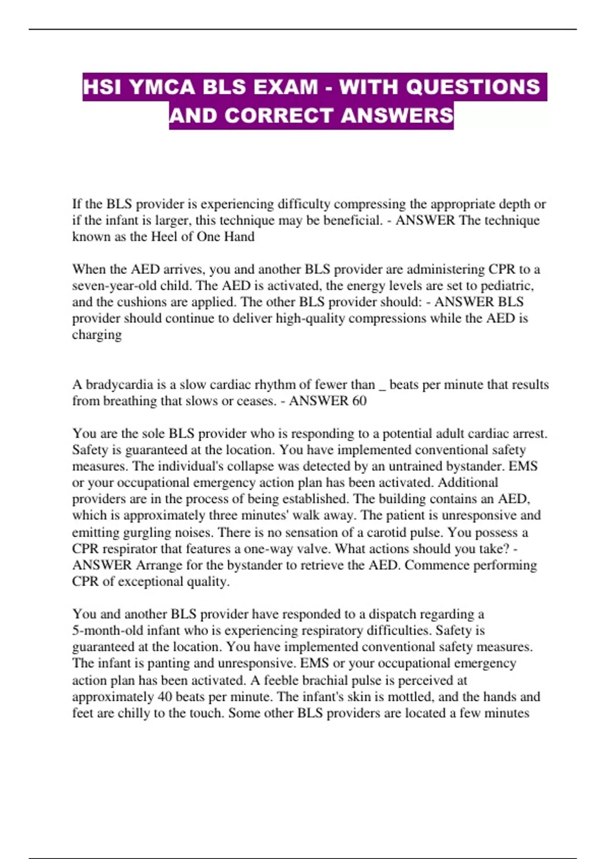 HSI YMCA BLS EXAM - WITH QUESTIONS AND CORRECT ANSWERS...