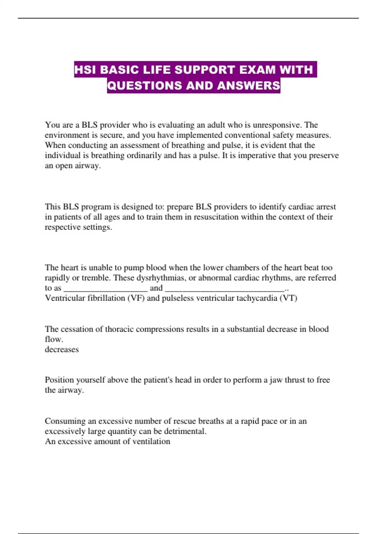 HSI BASIC LIFE SUPPORT EXAM WITH QUESTIONS AND ANSWERS