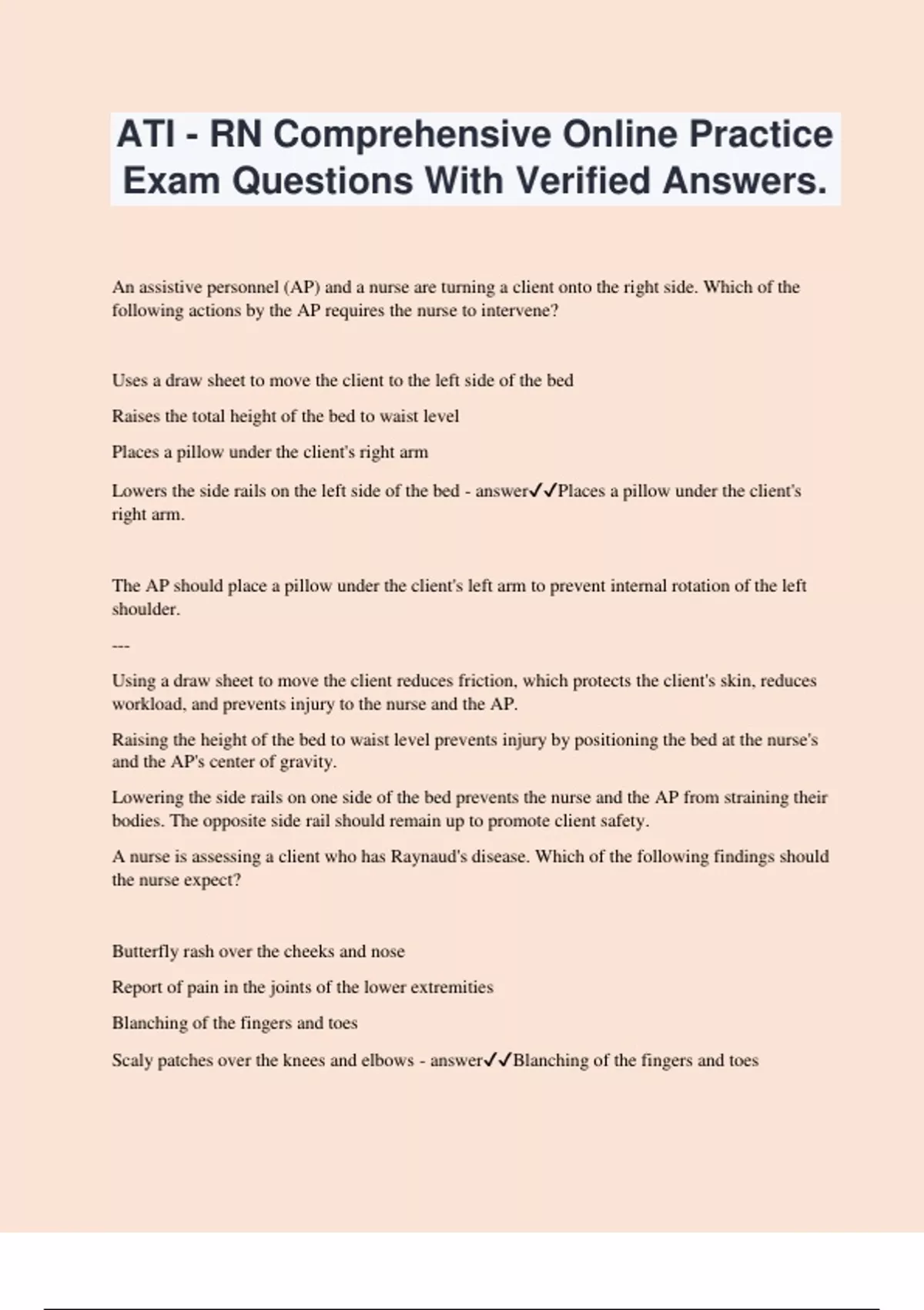 ATI - RN Comprehensive Online Practice Exam Questions With Verified Answers. An assistive personnel (AP) and a nurse are turning a client onto the right side. Which of the following actions by the AP requires the nurse to intervene? Uses a draw sheet to move the client to the left side of the bed Raises the total height of the bed to waist level Places a pillow under the client's right arm Lowers the side rails on the left side of the bed - answerPlaces a pillow under the client's right arm. The AP should place a pillow under the client's left arm to prevent internal rotation of the left shoulder. --- Using a draw sheet to move the client reduces friction, which protects the client's skin, reduces workload, and prevents injury to the nurse and the AP. Raising the height of the bed to waist level prevents injury by positioning the bed at the nurse's and the AP's center of gravity. Lowering the side rails on one side of the bed prevents the nurse and the AP from straining their bodies. The opposite side rail should remain up to promote client safety. A nurse is assessing a client who has Raynaud's disease. Which of the following findings should the nurse expect? Butterfly rash over the cheeks and nose Report of pain in the joints of the lower extremities Blanching of the fingers and toes Scaly patches over the knees and elbows - answerBlanching of the fingers and toes A client who has Raynaud's disease can have blanching of the fingers and toes in response to exposure to cold or emotional stress. Pallor develops first, then cyanosis, followed by redness or heat as the vessels reperfuse, before the skin returns to the client's baseline tone. --- A client who has lupus erythematosus is likely to have a butterfly rash over the cheeks and nose. A client who has osteoarthritis is likely to have pain in the joints of the lower extremities. A client who has psoriasis is likely to have scaly patches over the knees and elbows. A nurse is providing teaching about improving nutrition for a client who has multiple sclerosis. Which of the following instructions should the nurse include? (Select all that apply.) "A speech pathologist will be performing a swallowing study for you." "You should rest before eating a meal." "You should restrict foods that are high in vitamin D." "Reduce your intake of dietary fiber." "Thicken your beverages before drinking." - answer"A speech pathologist will be performing a swallowing study for you." "You should rest before eating a meal." "Thicken your beverages before drinking." The nurse should instruct the client that a swallowing study will be performed to determine the client's risk for aspiration due to difficulty swallowing, which is a manifestation of multiple sclerosis. The nurse should encourage the client to rest before each meal. Clients who have multiple sclerosis often report weakness and are easily fatigued. The nurse should instruct the client that liquids should be thickened to reduce the risk of aspiration due to difficulty swallowing, which is a manifestation of multiple sclerosis. --- The nurse should instruct the client to maintain adequate vitamin D levels, because vitamin D deficiency is a risk factor for multiple sclerosis. The nurse should instruct the client to increase dietary fiber and fluids to decrease the risk of constipation, which is a manifestation of multiple sclerosis. A nurse is caring for an older adult client. Which of the following findings should the nurse recognize as a physiological change associated with aging? Decreased blood pressure Increased cardiac output Increased oral temperature Decreased lung expansion - answerDecreased lung expansion Older adult clients are more likely to have decreased lung expansion due to decreased mobility of the ribs. --- Older adult clients are more likely to have an increased systolic blood pressure with a diastolic pressure that does not change. Older adult clients also have increased incidence of orthostatic hypotension. Older adult clients are more likely to have decreased cardiac output. Older adult clients are more likely to have decreased oral temperature. A nurse is caring for a client who is immediately postoperative following a total vaginal hysterectomy. Which of the following actions should the nurse take first? Measure the client's vital signs. Reposition the client. Encourage the client to use an incentive spirometer. Administer pain medication. - answerMeasure the client's vital signs. The first action the nurse should take when using the nursing process is to assess the client. The nurse should monitor the client's vital signs every 15 min until stable and then every 4 hr for the next 48 hr. --- The nurse should reposition the client every 2 hr to prevent postoperative complications such as atelectasis. However, there is another action the nurse should take first.