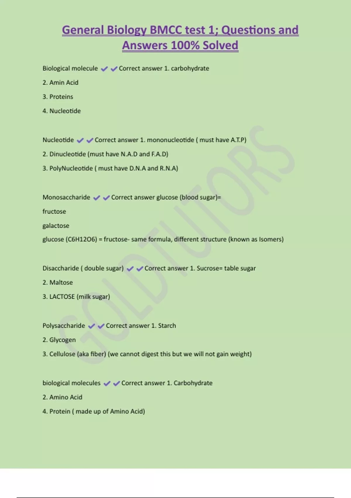 General Biology BMCC test 1; Questions and Answers 100% Solved Biological molecule Correct answer 1. carbohydrate 2. Amin Acid 3. Proteins 4. Nucleotide Nucleotide Correct answer 1. mononucleotide ( must have A.T.P) 2. Dinucleotide (must have N.A.D and F.A.D) 3. PolyNucleotide ( must have D.N.A and R.N.A) Monosaccharide Correct answer glucose (blood sugar)= fructose galactose glucose (C6H12O6) = fructose- same formula, different structure (known as Isomers) Disaccharide ( double sugar) Correct answer 1. Sucrose= table sugar 2. Maltose 3. LACTOSE (milk sugar)
