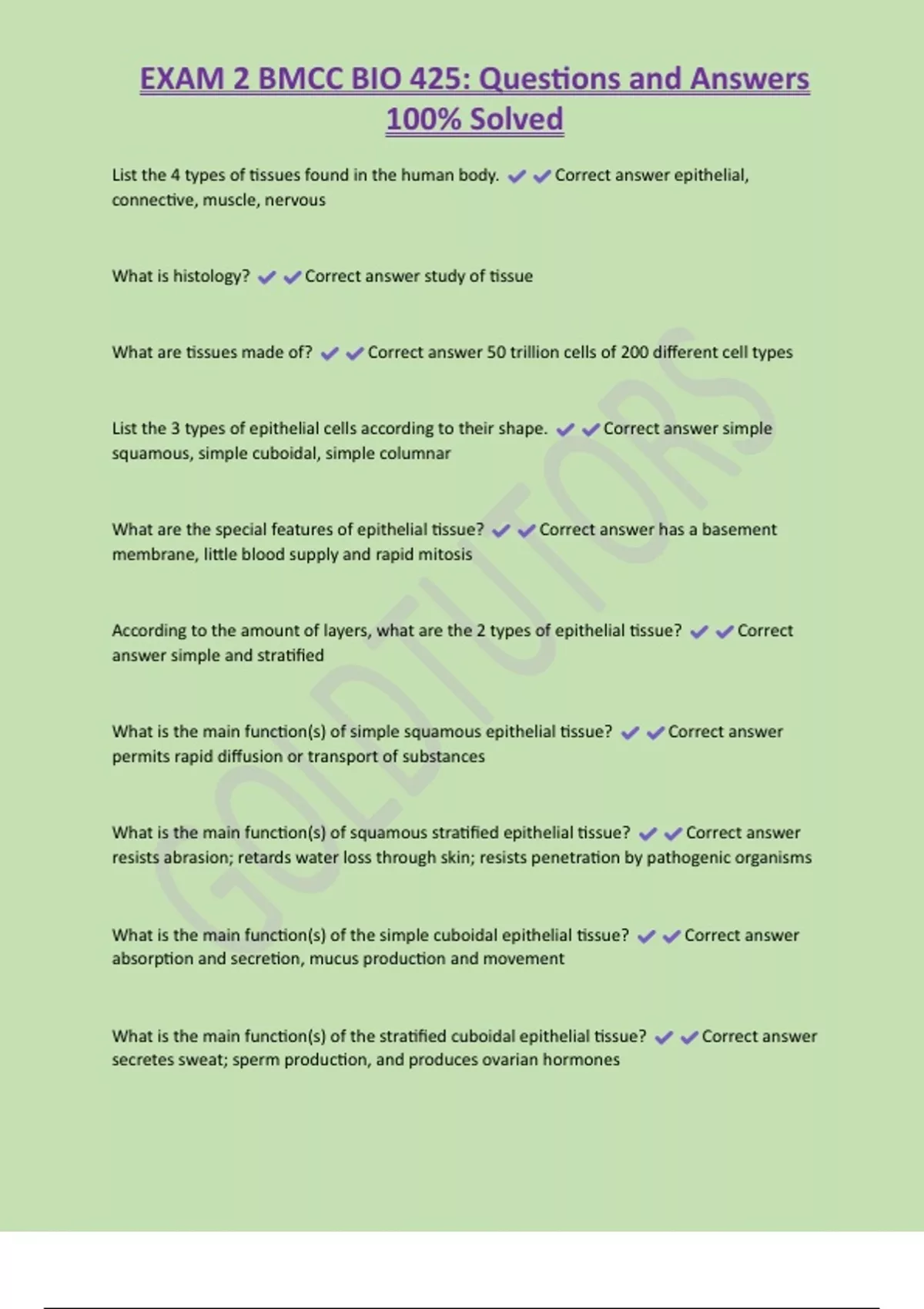 EXAM 2 BMCC BIO 425: Questions and Answers 100% Solved List the 4 types of tissues found in the human body. Correct answer epithelial, connective, muscle, nervous What is histology? Correct answer study of tissue What are tissues made of? Correct answer 50 trillion cells of 200 different cell types List the 3 types of epithelial cells according to their shape. Correct answer simple squamous, simple cuboidal, simple columnar What are the special features of epithelial tissue? Correct answer has a basement membrane, little blood supply and rapid mitosis According to the amount of layers, what are the 2 types of epithelial tissue? Correct answer simple and stratified