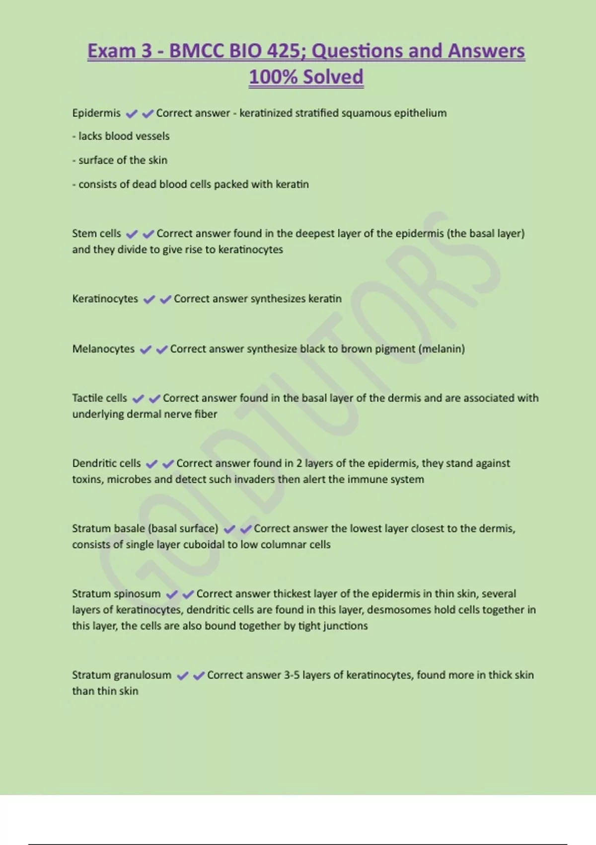Exam 3 - BMCC BIO 425; Questions and Answers 100% Solved Epidermis Correct answer - keratinized stratified squamous epithelium - lacks blood vessels - surface of the skin - consists of dead blood cells packed with keratin Stem cells Correct answer found in the deepest layer of the epidermis (the basal layer) and they divide to give rise to keratinocytes Keratinocytes Correct answer synthesizes keratin Melanocytes Correct answer synthesize black to brown pigment (melanin) Tactile cells Correct answer found in the basal layer of the dermis and are associated with underlying dermal nerve fiber