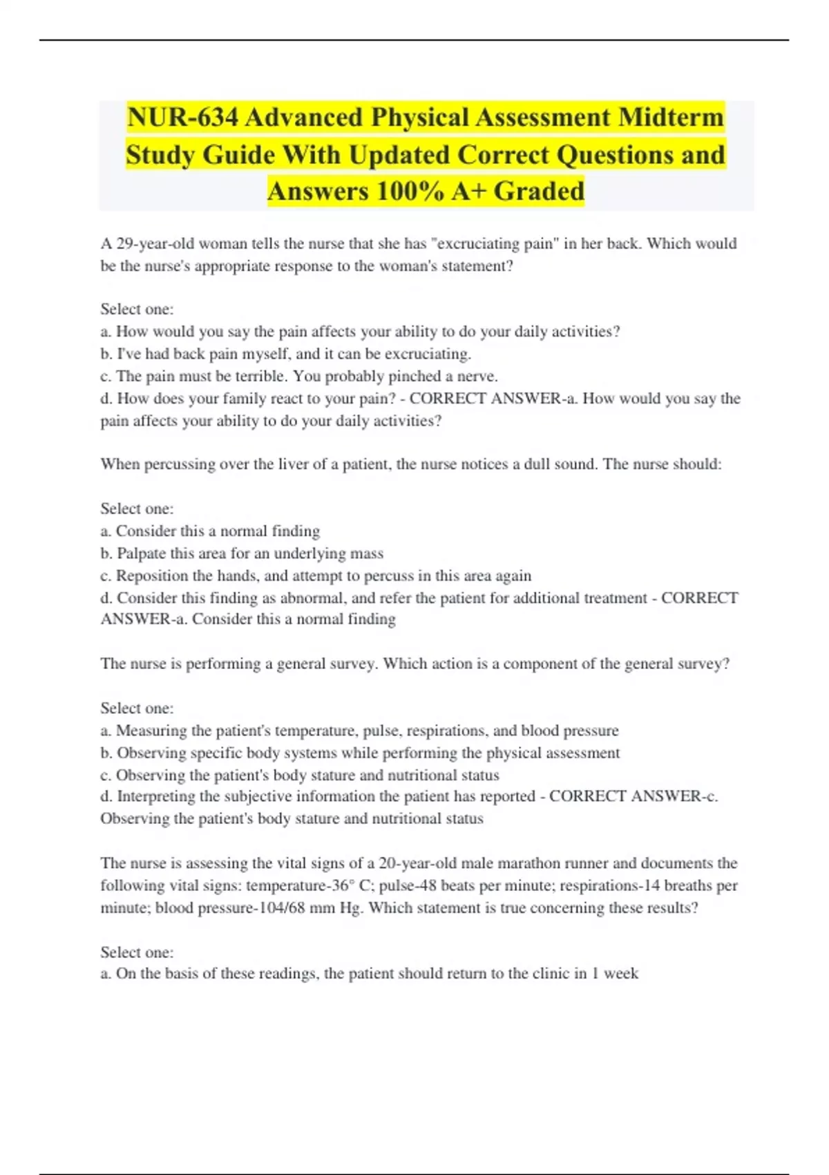 NUR-634 Advanced Physical Assessment Midterm Study Guide With Updated Correct Questions and Answers 100% A+ Graded A 29-year-old woman tells the nurse that she has "excruciating pain" in her back. Which would be the nurse's appropriate response to the woman's statement? Select one: a. How would you say the pain affects your ability to do your daily activities? b. I've had back pain myself, and it can be excruciating. c. The pain must be terrible. You probably pinched a nerve. d. How does your family react to your pain? - CORRECT ANSWER-a. How would you say the pain affects your ability to do your daily activities? When percussing over the liver of a patient, the nurse notices a dull sound. The nurse should: Select one: a. Consider this a normal finding b. Palpate this area for an underlying mass c. Reposition the hands, and attempt to percuss in this area again d. Consider this finding as abnormal, and refer the patient for additional treatment - CORRECT ANSWER-a. Consider this a normal finding The nurse is performing a general survey. Which action is a component of the general survey? Select one: a. Measuring the patient's temperature, pulse, respirations, and blood pressure b. Observing specific body systems while performing the physical assessment c. Observing the patient's body stature and nutritional status d. Interpreting the subjective information the patient has reported - CORRECT ANSWER-c. Observing the patient's body stature and nutritional status The nurse is assessing the vital signs of a 20-year-old male marathon runner and documents the following vital signs: temperature-36° C; pulse-48 beats per minute; respirations-14 breaths per minute; blood pressure-104/68 mm Hg. Which statement is true concerning these results? Select one: a. On the basis of these readings, the patient should return to the clinic in 1 week b. These are normal vital signs for a healthy, athletic adult c. The patient's pulse rate is not normal—his physician should be notified d. The patient is experiencing tachycardia - CORRECT ANSWER-b. These are normal vital signs for a healthy, athletic adult Correct The review of systems provides the nurse with: Select one: a. Information regarding health promotion practices b. Physical findings related to each system c. Information necessary for the nurse to diagnose the patient's medical problem d. An opportunity to teach the patient medical terms - CORRECT ANSWER-b. Physical findings related to each system Which technique is correct when the nurse is assessing the radial pulse of a patient? The pulse is counted for: Select one: a. 2 full minutes to detect any variation in amplitude b. 10 seconds and then multiplied by 6, if the patient has no history of cardiac abnormalities c. 1 minute, if the rhythm is irregular d. 15 seconds and then multiplied by 4, if the rhythm is regular - CORRECT ANSWER-c. 1 minute, if the rhythm is irregular Correct When assessing a patient's pulse, the nurse should also notice which of these characteristics? Select one: a. Force b. Timing in cardiac cycle c. Pallor d. Capillary refill - CORRECT ANSWER-a. Force Correct The nurse is reviewing the development of culture. Which statement is correct regarding the development of one's culture? Culture is: Select one: a. A nonspecific phenomenon and is adaptive but unnecessary. b. Biologically determined on the basis of physical characteristics. c. Learned through language acquisition and socialization. d. Genetically determined on the basis of racial background. - CORRECT ANSWER-c. Learned through language acquisition and socialization. Correct The nurse is teaching a class on basic assessment skills. Which of these statements is true regarding the stethoscope and its use? Select one: a. Ideal tubing length should be 22 inches to dampen the distortion of sound. b. Fit and quality of the stethoscope are not as important as its ability to magnify sound. c. Slope of the earpieces should point posteriorly (toward the occiput). d. Although the stethoscope does not magnify sound, it does block out extraneous room noise. - CORRECT ANSWER-d. Although the stethoscope does not magnify sound, it does block out extraneous room noise. When the nurse is evaluating the reliability of a patient's responses, which of these statements would be correct? The patient: Select one: a. Provided consistent information and therefore is reliable b. Smiled throughout interview and therefore is assumed reliable c. Has a history of drug abuse and therefore is not reliable d. Would not answer questions concerning stress and therefore is not reliable - CORRECT ANSWER-a. Provided consistent information and therefore is reliable A newly admitted patient is in acute pain, has not been sleeping well lately, and is having difficulty breathing. How should the nurse prioritize these problems? Select one: a. Breathing, pain, and sleep b. Sleep, pain, and breathing c. Breathing, sleep, and pain d. Sleep, breathing, and pain - CORRECT ANSWER-a. Breathing, pain, and sleep Correct The nurse is reviewing the principles of pain. Which type of pain is due to an abnormal processing of the pain impulse through the peripheral or central nervous system? Select one: a. Cutaneous b. Visceral c. Neuropathic