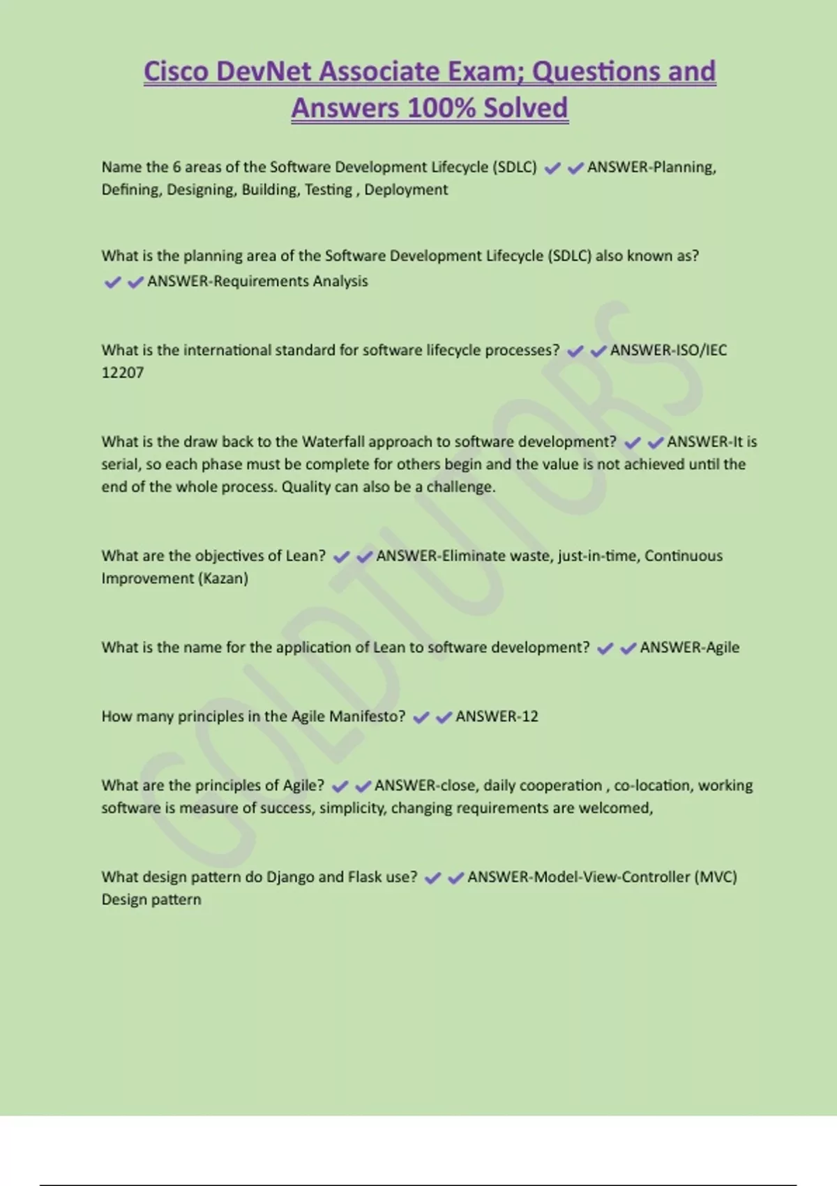 Cisco DevNet Associate Exam; Questions and Answers 100% Solved Name the 6 areas of the Software Development Lifecycle (SDLC) ANSWER-Planning, Defining, Designing, Building, Testing , Deployment What is the planning area of the Software Development Lifecycle (SDLC) also known as? ANSWER-Requirements Analysis What is the international standard for software lifecycle processes? ANSWER-ISO/IEC 12207 What is the draw back to the Waterfall approach to software development? ANSWER-It is serial, so each phase must be complete for others begin and the value is not achieved until the end of the whole process. Quality can also be a challenge.