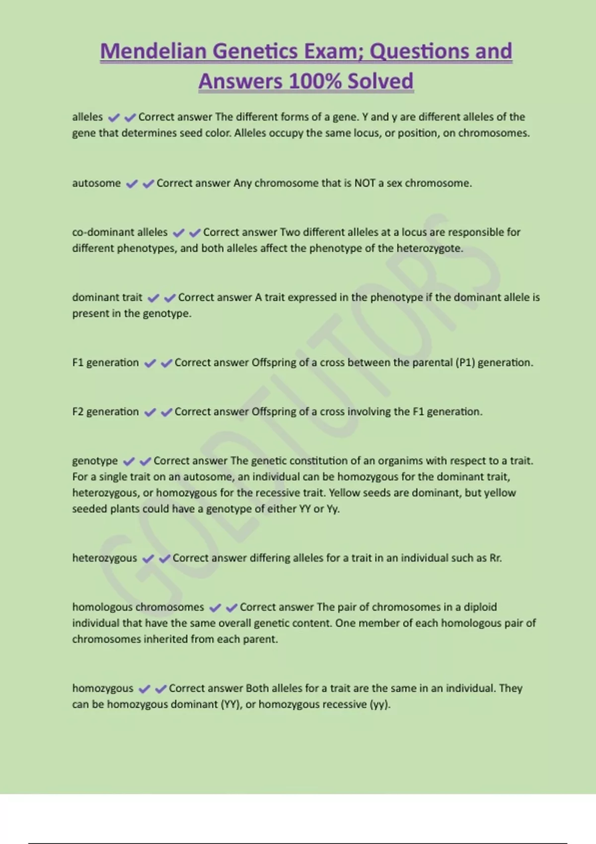 Mendelian Genetics Exam; Questions and Answers 100% Solved alleles Correct answer The different forms of a gene. Y and y are different alleles of the gene that determines seed color. Alleles occupy the same locus, or position, on chromosomes. autosome Correct answer Any chromosome that is NOT a sex chromosome. co-dominant alleles Correct answer Two different alleles at a locus are responsible for different phenotypes, and both alleles affect the phenotype of the heterozygote. dominant trait Correct answer A trait expressed in the phenotype if the dominant allele is present in the genotype.