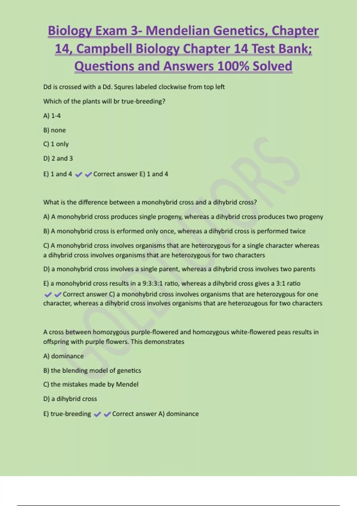 Biology Exam 3- Mendelian Genetics, Chapter 14, Campbell Biology Chapter 14 Test Bank; Questions and Answers 100% Solved Dd is crossed with a Dd. Squres labeled clockwise from top left Which of the plants will br true-breeding? A) 1-4 B) none C) 1 only D) 2 and 3 E) 1 and 4 Correct answer E) 1 and 4