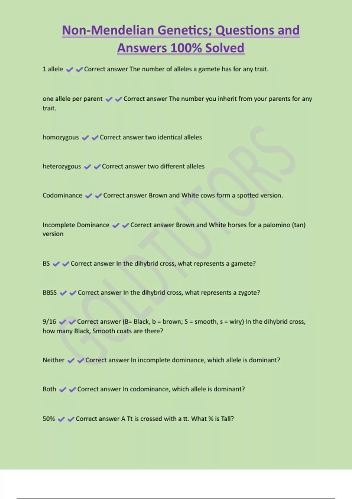Non-Mendelian Genetics; Questions and Answers 100% Solved 1 allele Correct answer The number of alleles a gamete has for any trait. one allele per parent Correct answer The number you inherit from your parents for any trait. homozygous Correct answer two identical alleles heterozygous Correct answer two different alleles Codominance Correct answer Brown and White cows form a spotted version.
