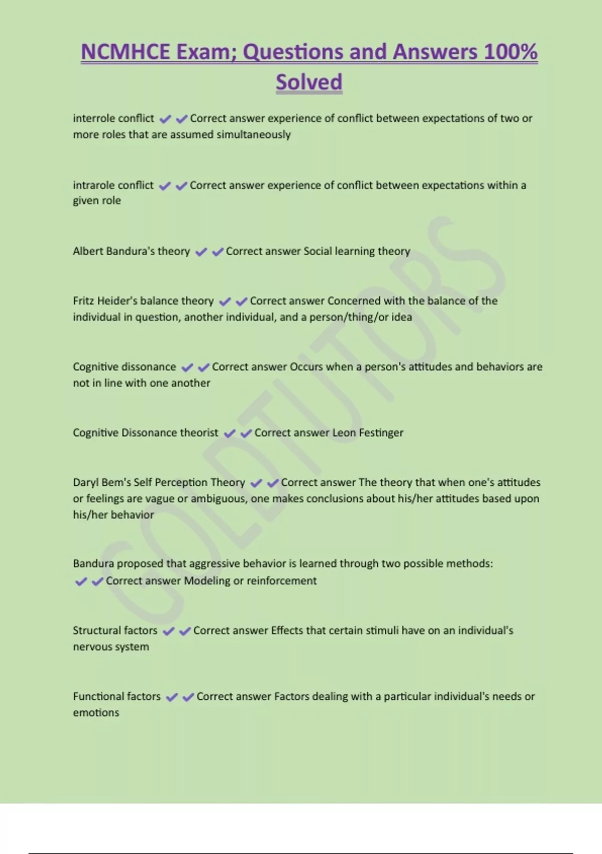NCMHCE Exam; Questions and Answers 100% Solved interrole conflict Correct answer experience of conflict between expectations of two or more roles that are assumed simultaneously intrarole conflict Correct answer experience of conflict between expectations within a given role Albert Bandura's theory Correct answer Social learning theory Fritz Heider's balance theory Correct answer Concerned with the balance of the individual in question, another individual, and a person/thing/or idea Cognitive dissonance Correct answer Occurs when a person's attitudes and behaviors are not in line with one another