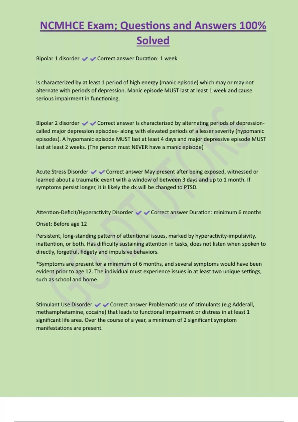 NCMHCE Exam; Questions and Answers 100% Solved Bipolar 1 disorder Correct answer Duration: 1 week Is characterized by at least 1 period of high energy (manic episode) which may or may not alternate with periods of depression. Manic episode MUST last at least 1 week and cause serious impairment in functioning. Bipolar 2 disorder Correct answer Is characterized by alternating periods of depressioncalled major depression episodes- along with elevated periods of a lesser severity (hypomanic episodes). A hypomanic episode MUST last at least 4 days and major depressive episode MUST last at least 2 weeks. (The person must NEVER have a manic episode)