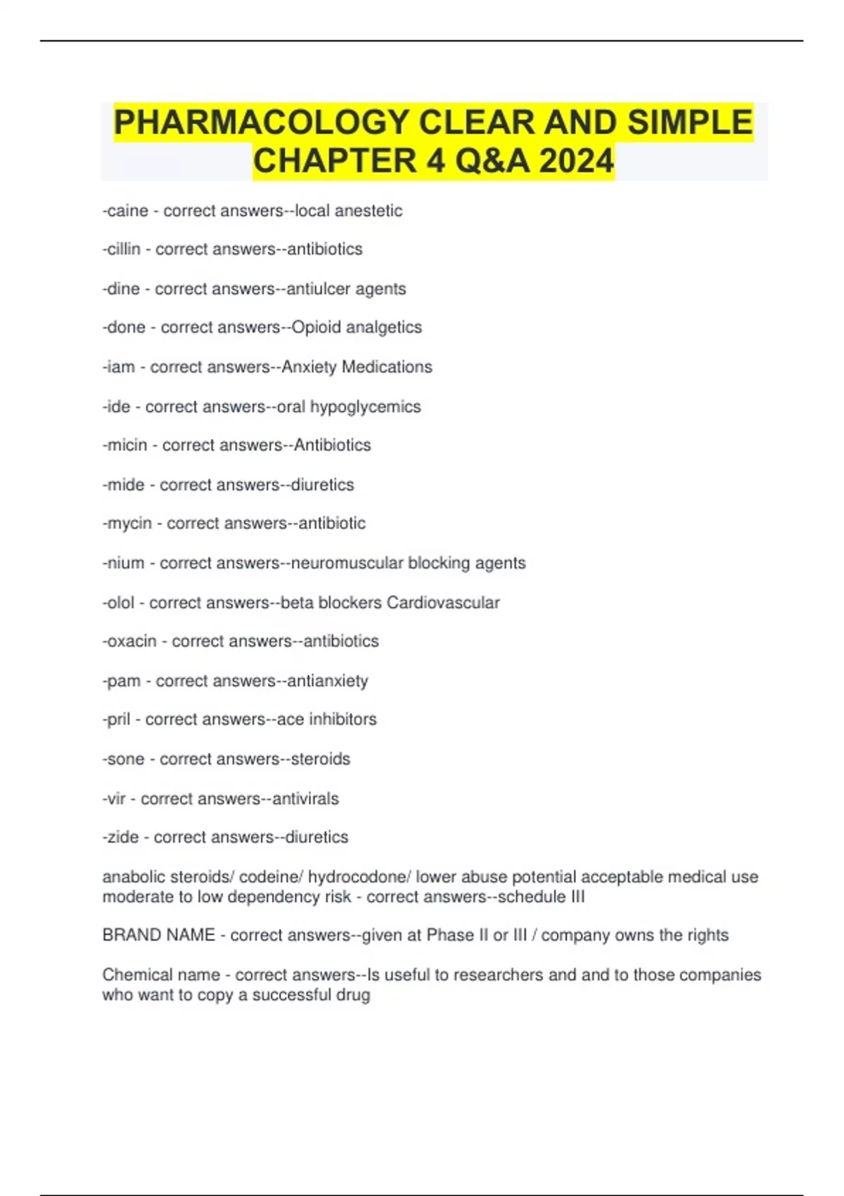 -caine - correct answers--local anestetic -cillin - correct answers--antibiotics -dine - correct answers--antiulcer agents -done - correct answers--Opioid analgetics -iam - correct answers--Anxiety Medications -ide - correct answers--oral hypoglycemics -micin - correct answers--Antibiotics -mide - correct answers--diuretics -mycin - correct answers--antibiotic -nium - correct answers--neuromuscular blocking agents -olol - correct answers--beta blockers Cardiovascular -oxacin - correct answers--antibiotics -pam - correct answers--antianxiety -pril - correct answers--ace inhibitors -sone - correct answers--steroids -vir - correct answers--antivirals -zide - correct answers--diuretics anabolic steroids/ codeine/ hydrocodone/ lower abuse potential acceptable medical use moderate to low dependency risk - correct answers--schedule III