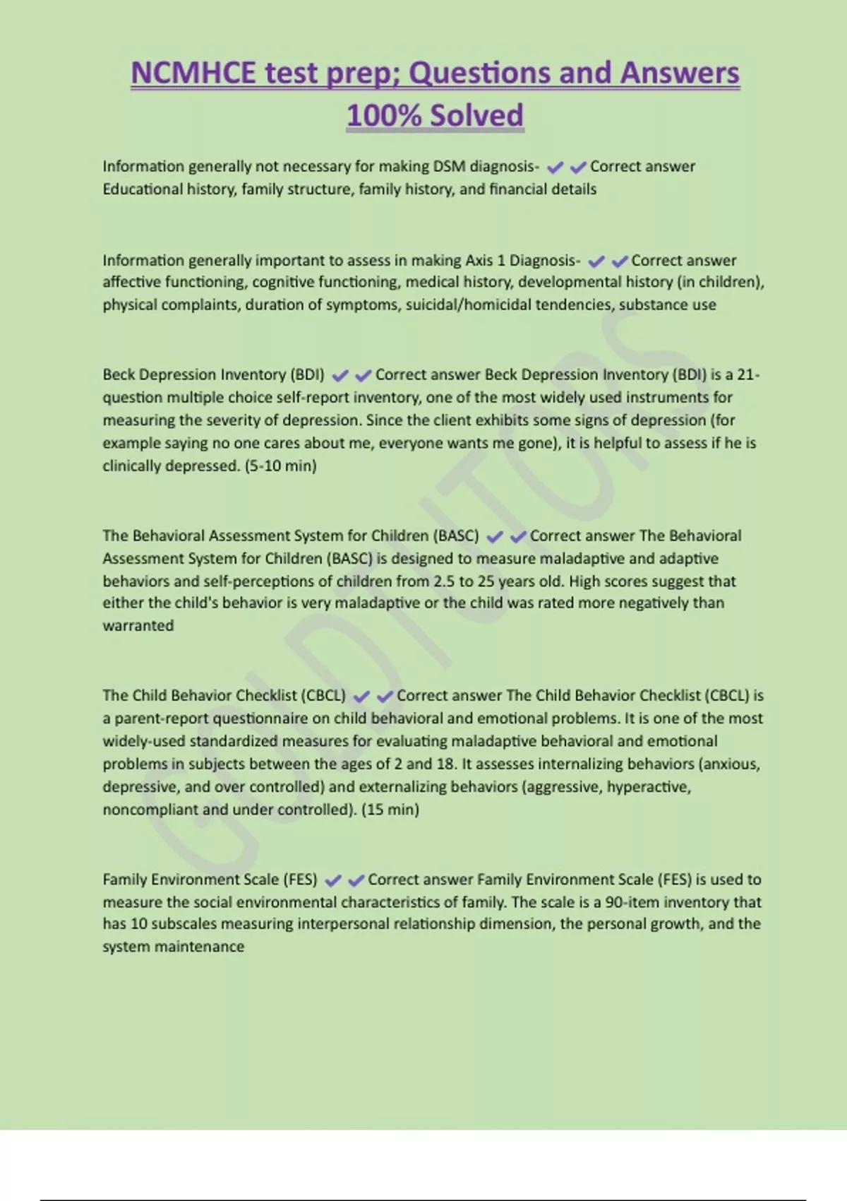 NCMHCE test prep; Questions and Answers 100% Solved Information generally not necessary for making DSM diagnosis- Correct answer Educational history, family structure, family history, and financial details Information generally important to assess in making Axis 1 Diagnosis- Correct answer affective functioning, cognitive functioning, medical history, developmental history (in children), physical complaints, duration of symptoms, suicidal/homicidal tendencies, substance use Beck Depression Inventory (BDI) Correct answer Beck Depression Inventory (BDI) is a 21- question multiple choice self-report inventory, one of the most widely used instruments for measuring the severity of depression. Since the client exhibits some signs of depression (for example saying no one cares about me, everyone wants me gone), it is helpful to assess if he is clinically depressed. (5-10 min)