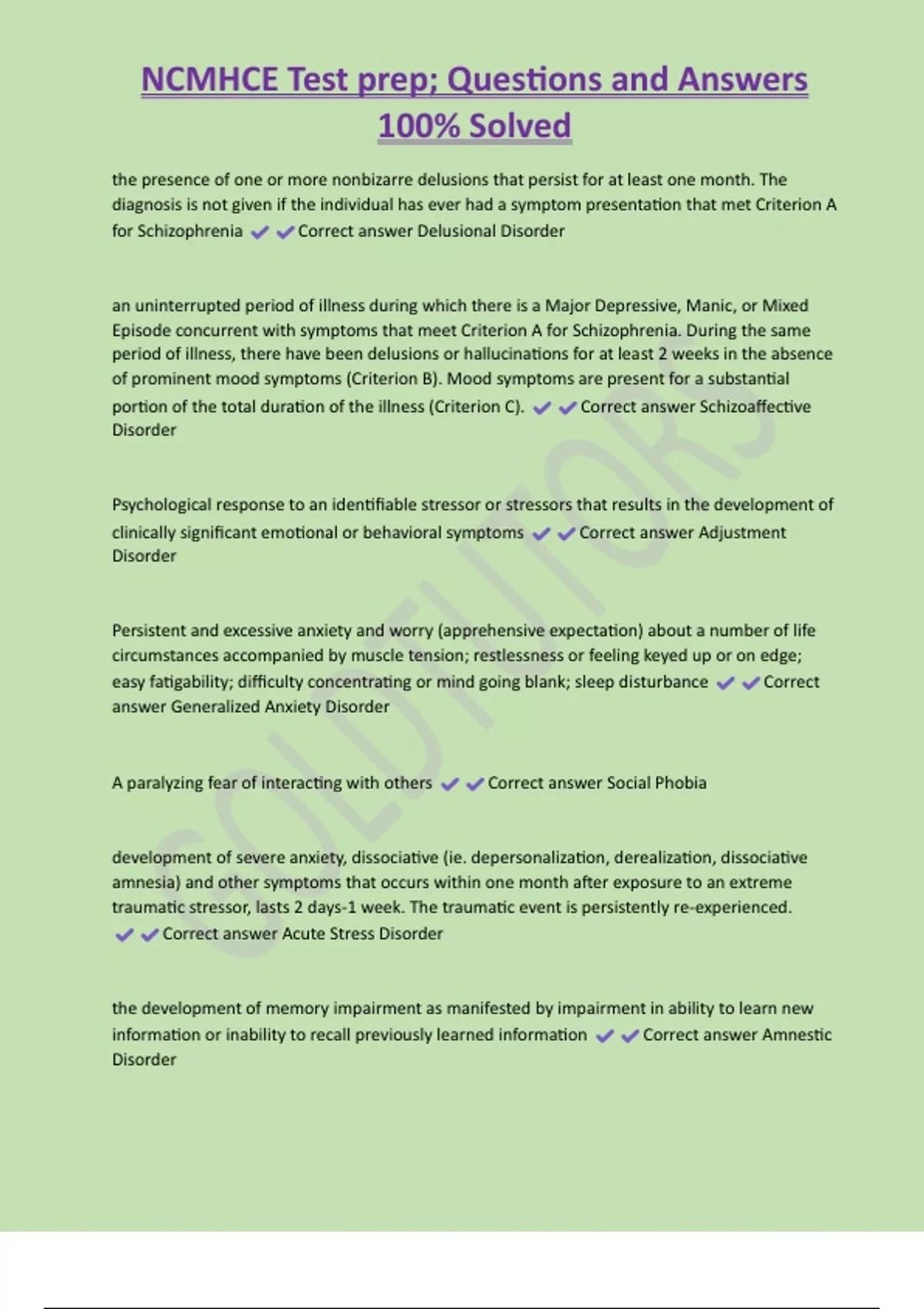 NCMHCE Test prep; Questions and Answers 100% Solved the presence of one or more nonbizarre delusions that persist for at least one month. The diagnosis is not given if the individual has ever had a symptom presentation that met Criterion A for Schizophrenia Correct answer Delusional Disorder an uninterrupted period of illness during which there is a Major Depressive, Manic, or Mixed Episode concurrent with symptoms that meet Criterion A for Schizophrenia. During the same period of illness, there have been delusions or hallucinations for at least 2 weeks in the absence of prominent mood symptoms (Criterion B). Mood symptoms are present for a substantial portion of the total duration of the illness (Criterion C). Correct answer Schizoaffective Disorder