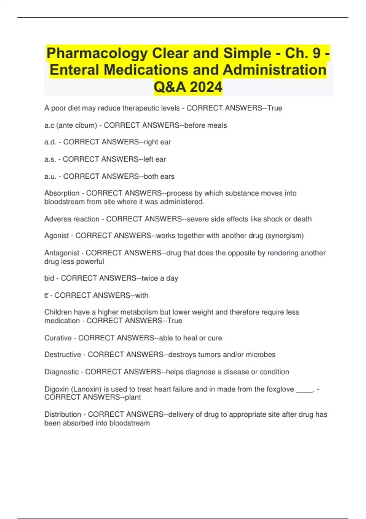 A poor diet may reduce therapeutic levels - CORRECT ANSWERS--True a.c (ante cibum) - CORRECT ANSWERS--before meals a.d. - CORRECT ANSWERS--right ear a.s. - CORRECT ANSWERS--left ear a.u. - CORRECT ANSWERS--both ears Absorption - CORRECT ANSWERS--process by which substance moves into bloodstream from site where it was administered. Adverse reaction - CORRECT ANSWERS--severe side effects like shock or death Agonist - CORRECT ANSWERS--works together with another drug (synergism) Antagonist - CORRECT ANSWERS--drug that does the opposite by rendering another drug less powerful bid - CORRECT ANSWERS--twice a day - CORRECT ANSWERS--with Children have a higher metabolism but lower weight and therefore require less medication - CORRECT ANSWERS--True Curative - CORRECT ANSWERS--able to heal or cure Destructive - CORRECT ANSWERS--destroys tumors and/or microbes Diagnostic - CORRECT ANSWERS--helps diagnose a disease or condition Digoxin (Lanoxin) is used to treat heart failure and in made from the foxglove ____. - CORRECT ANSWERS--plan