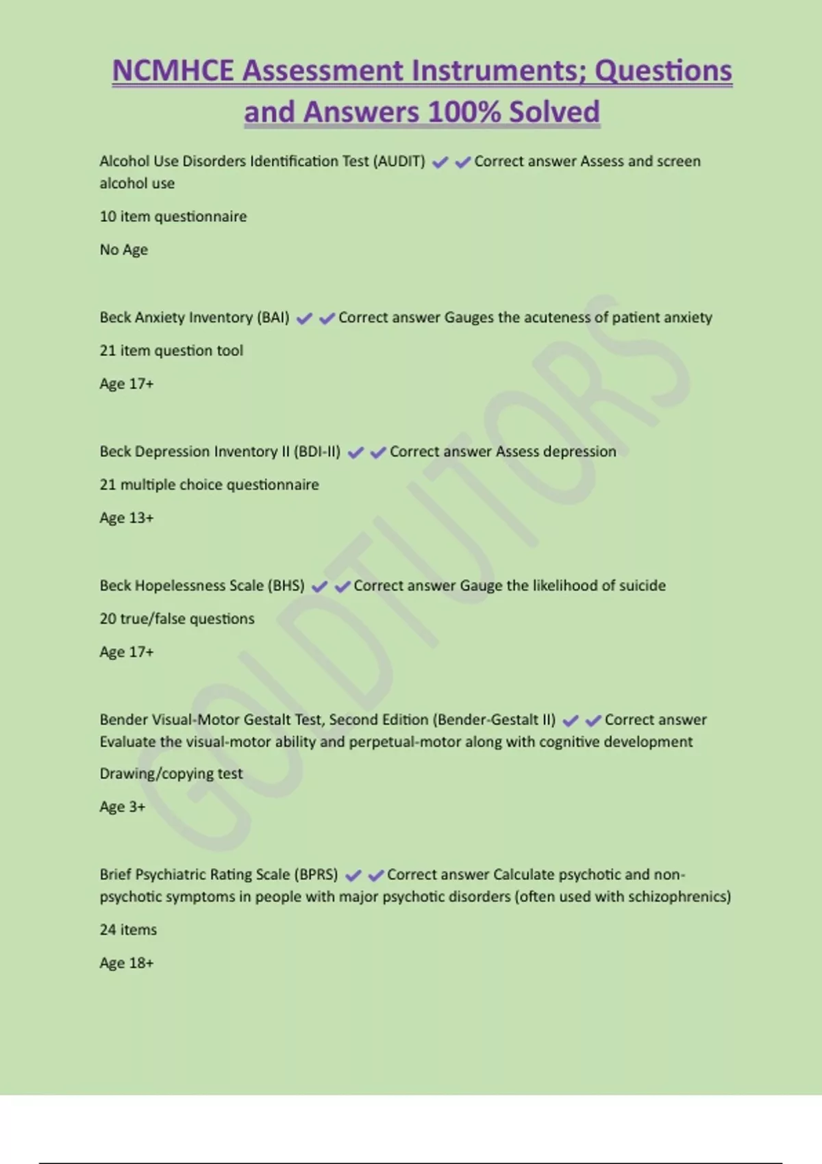 NCMHCE Assessment Instruments; Questions and Answers 100% Solved Alcohol Use Disorders Identification Test (AUDIT) Correct answer Assess and screen alcohol use 10 item questionnaire No Age Beck Anxiety Inventory (BAI) Correct answer Gauges the acuteness of patient anxiety 21 item question tool Age 17+ Beck Depression Inventory II (BDI-II) Correct answer Assess depression 21 multiple choice questionnaire Age 13+