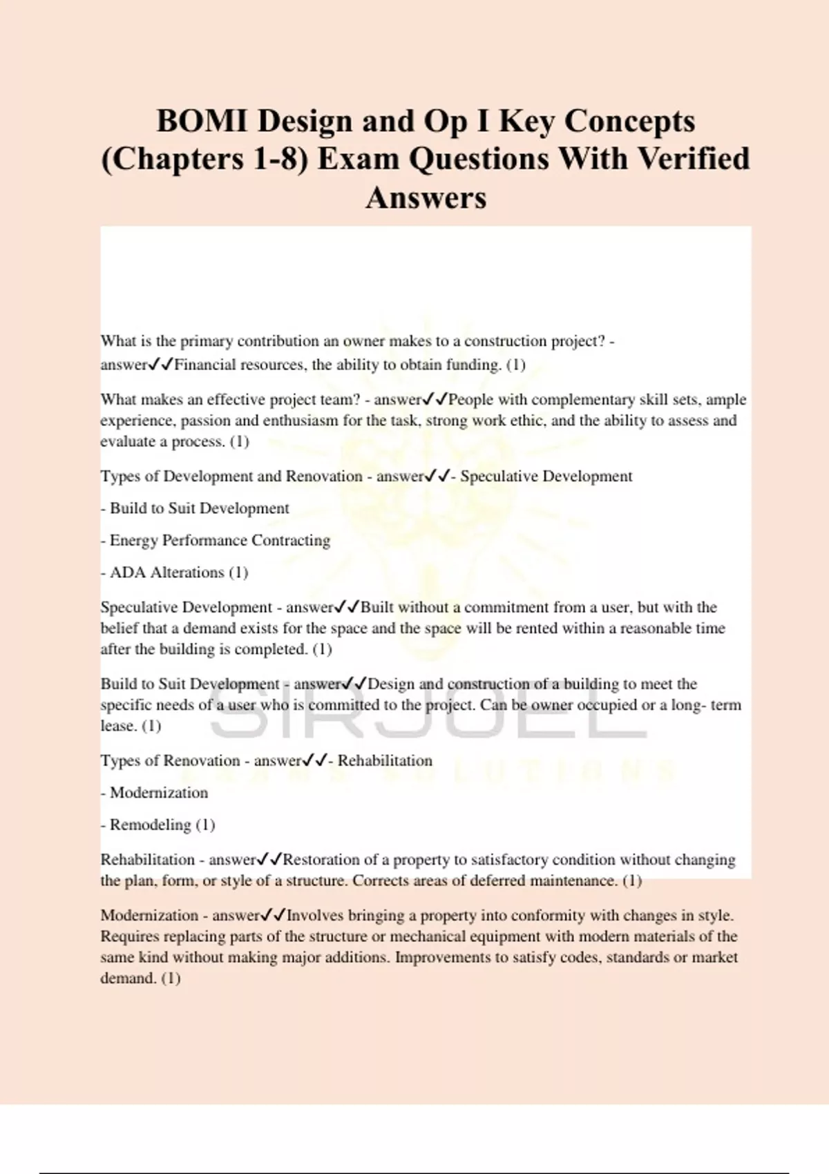 BOMI Design and Op I Key Concepts (Chapters 1-8) Exam Questions With Verified Answers What is the primary contribution an owner makes to a construction project? - answerFinancial resources, the ability to obtain funding. (1) What makes an effective project team? - answerPeople with complementary skill sets, ample experience, passion and enthusiasm for the task, strong work ethic, and the ability to assess and evaluate a process. (1) Types of Development and Renovation - answer- Speculative Development - Build to Suit Development - Energy Performance Contracting - ADA Alterations (1) Speculative Development - answerBuilt without a commitment from a user, but with the belief that a demand exists for the space and the space will be rented within a reasonable time after the building is completed. (1) Build to Suit Development - answerDesign and construction of a building to meet the specific needs of a user who is committed to the project. Can be owner occupied or a long- term lease. (1) Types of Renovation - answer- Rehabilitation - Modernization - Remodeling (1) Rehabilitation - answerRestoration of a property to satisfactory condition without changing the plan, form, or style of a structure. Corrects areas of deferred maintenance. (1) Modernization - answerInvolves bringing a property into conformity with changes in style. Requires replacing parts of the structure or mechanical equipment with modern materials of the same kind without making major additions. Improvements to satisfy codes, standards or market demand. (1) Remodeling - answerChanging the plan, form, or style of a structure to correct functional or economic deficiencies. Can reestablish usefulness. Not to be confused with alterations. (1) Energy Performance Contracting - answerAdjust and refine existing buildings to reduce operating expenses and energy costs for the owner. Can be speculative or performance development. (1) ADA Alterations - answerBased on ADA Act of 1990. Includes changes or rearrangement in structural parts or elements and changes or rearrangement in the plan configurations of walls and full height partitions. (1) What is used to determine space requirements? - answerA needs assessment and program of requirements. (1) Needs Assessment - answerAnalysis of space requirements of a specific user. Can inform the creation of the program of requirements. (1) Program of Requirements - answerIs divided into two sections: the architectural program and the functional program. Helps create final design documents. (1) Architectural Program - answerCreated during the design phase to accommodate the functional program. Establishes the size and general character of the proposed building. Used to evaluate project documents. (1) Functional Program - answerInvolves creating written documents that identify tangible needs a building must meet. Square footage requested in the statement of need is compared to the space available in existing or proposed buildings through a test fit. (1) What are the two types of building design codes? - answerBuilding Codes and Zoning Codes (1) Zoning Codes - answerControl the use, height, and mass of a building. Seeks to protect the health, safety, and welfare of the public. Address 3 primary areas: district zoning for permitted uses, area height and bulk regulations, special regulations. (1) Building Codes - answerPromote general safety by regulating the design and construction of the building's components. Each municipality adopts a model building code and adds amendments to accommodate local conditions. (1) What components are commonly included in construction contract documents? - answerWorking drawings, conditions of the contract, specifications (1) Focus Areas of Physical Feasibility - answerInvolves site analysis and selection. (1) Focus Areas of Economic Feasibility - answerInvolves market and real estate analysis. (1) What level of stakeholder participation is needed in the green approach to program development? - answerAll stakeholders participate in the development process. Teamwork and group participation are key. They can add fuel to the process and facilitate a smooth, efficient approval process. (1) 4 Primary Project Delivery Methods - answer- Design Bid Build - Design Build - CMAR - Multiple Prime Contracts (2) Design- Bid- Build Method - answerAn architectural firm is hired and serves as owner's agent. Primary responsibility is providing and managing the design and construction documents. Achieves the owner's goals with reasonable speed and cost. (2) Benefit of Design- Bid- Build Method - answerAchieves the owner's goals with reasonable speed and costs. (2) Limitations of Design- Bid- Build Method - answerProject management organizations can complete the project more quickly with lower costs. (2) Success Factors for Design- Bid Build Method - answer- Seamless project team communication - Ability to prequalify a team - Excellent contractor and subcontractor experience with the type of facility being built - Ability to restrain the contractor pool (2) Design- Build Method - answerOne entity enters into a single contract with an owner to provide architectural and engineering design and construction services. Guaranteed maximum price for the entire project is provided. Combines the design and construction. (2) Benefit of Design- Build Method - answerCombines the design and construction phases; encourages collaboration. (2) Limitations of Design- Build Method - answerSaving money for the owner is not a priority for the contractor. (2) CMAR Method - answerAKA construction management at risk, an owner contracts separately with a designer and a contractor. A construction manager is hired by the owner to promote a team effort and manage the two activities. (2) Differences between CMAR and Design- Bid- Build - answer- A construction manager is hired to manage the construction process including selecting subcontractors