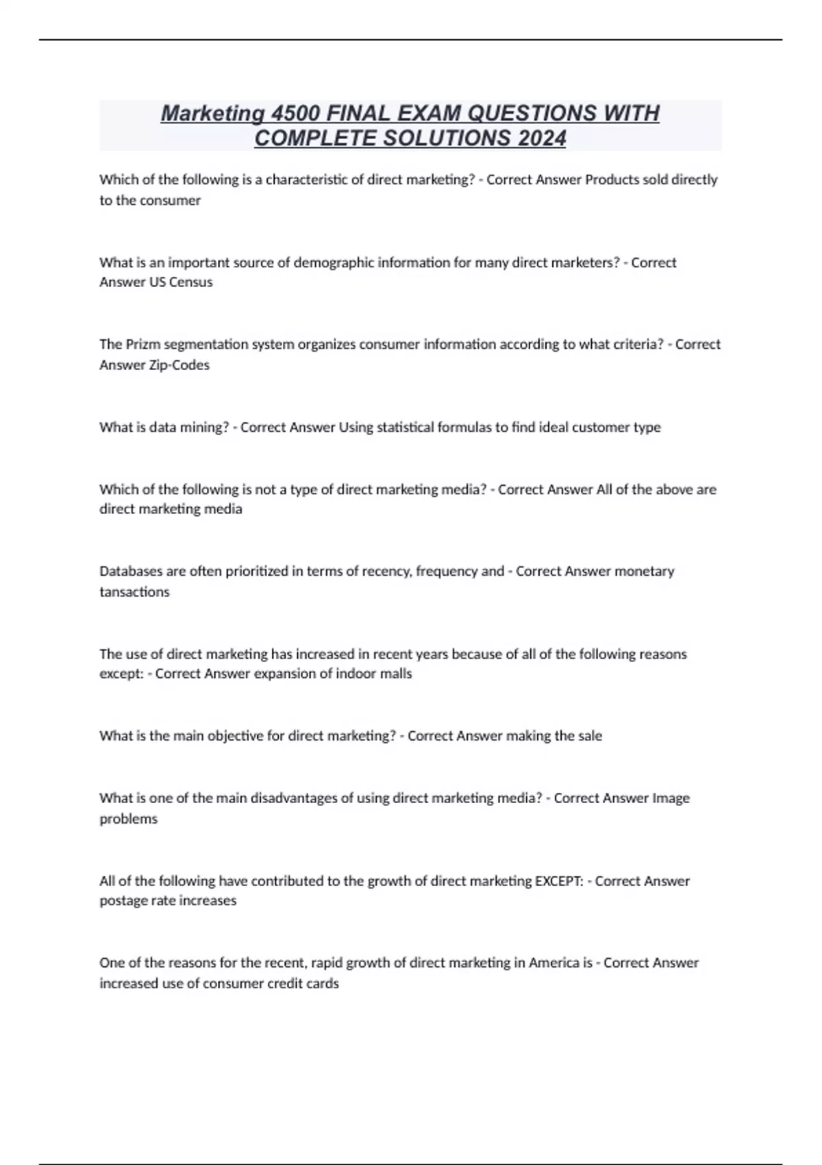 Marketing 4500 FINAL EXAM QUESTIONS WITH COMPLETE SOLUTIONS 2024 Which of the following is a characteristic of direct marketing? - Correct Answer Products sold directly to the consumer What is an important source of demographic information for many direct marketers? - Correct Answer US Census The Prizm segmentation system organizes consumer information according to what criteria? - Correct Answer Zip-Codes What is data mining? - Correct Answer Using statistical formulas to find ideal customer type Which of the following is not a type of direct marketing media? - Correct Answer All of the above are direct marketing media Databases are often prioritized in terms of recency, frequency and - Correct Answer monetary tansactions The use of direct marketing has increased in recent years because of all of the following reasons except: - Correct Answer expansion of indoor malls What is the main objective for direct marketing? - Correct Answer making the sale What is one of the main disadvantages of using direct marketing media? - Correct Answer Image problems All of the following have contributed to the growth of direct marketing EXCEPT: - Correct Answer postage rate increases One of the reasons for the recent, rapid growth of direct marketing in America is - Correct Answer increased use of consumer credit cards All of the following factors have contributed to the increased attractiveness of direct marketing EXCEPT: - Correct Answer attractiveness of malls for family entertainment