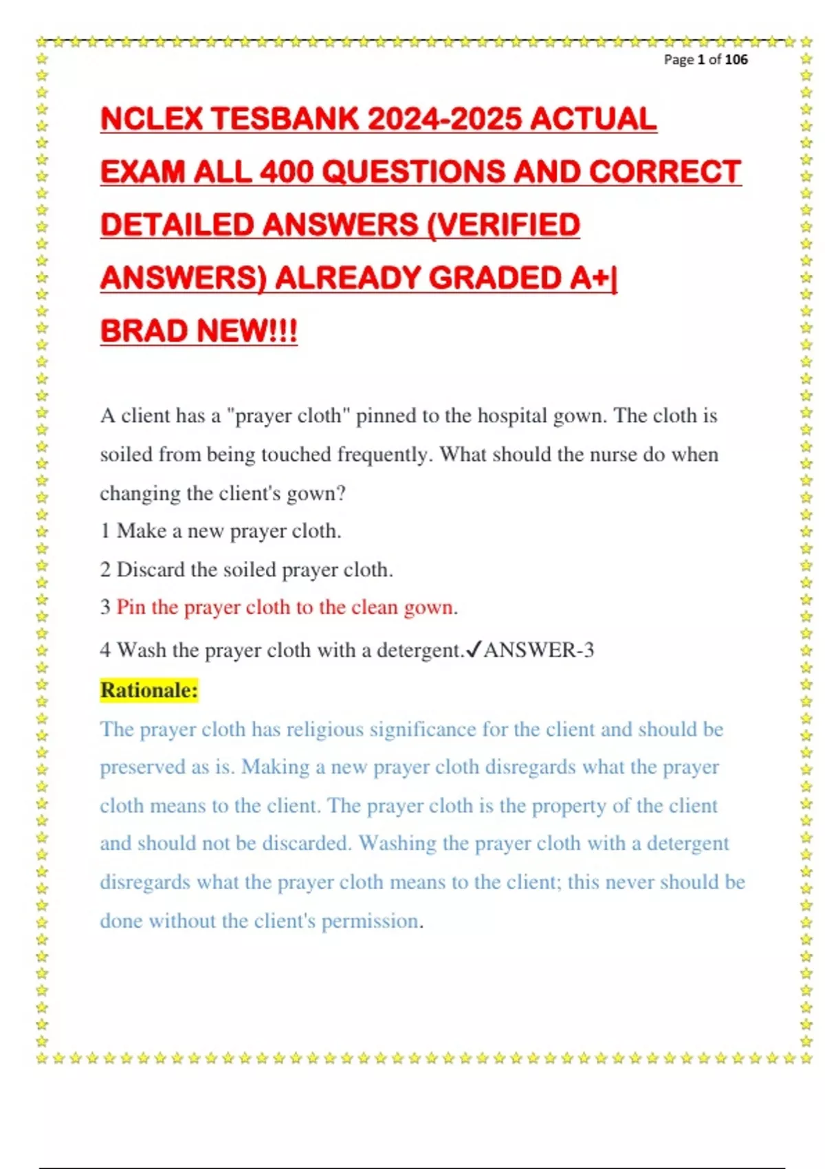 NCLEX TESBANK ACTUAL EXAM ALL 400 QUESTIONS AND CORRECT DETAILED ANSWERS (VERIFIED ANSWERS) ALREADY GRADED A+| BRAD NEW!!!