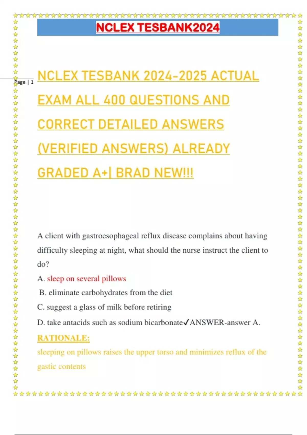 NCLEX TESBANK ACTUAL EXAM ALL 400 QUESTIONS AND CORRECT DETAILED ANSWERS (VERIFIED ANSWERS) ALREADY GRADED A+| BRAD NEW!!!