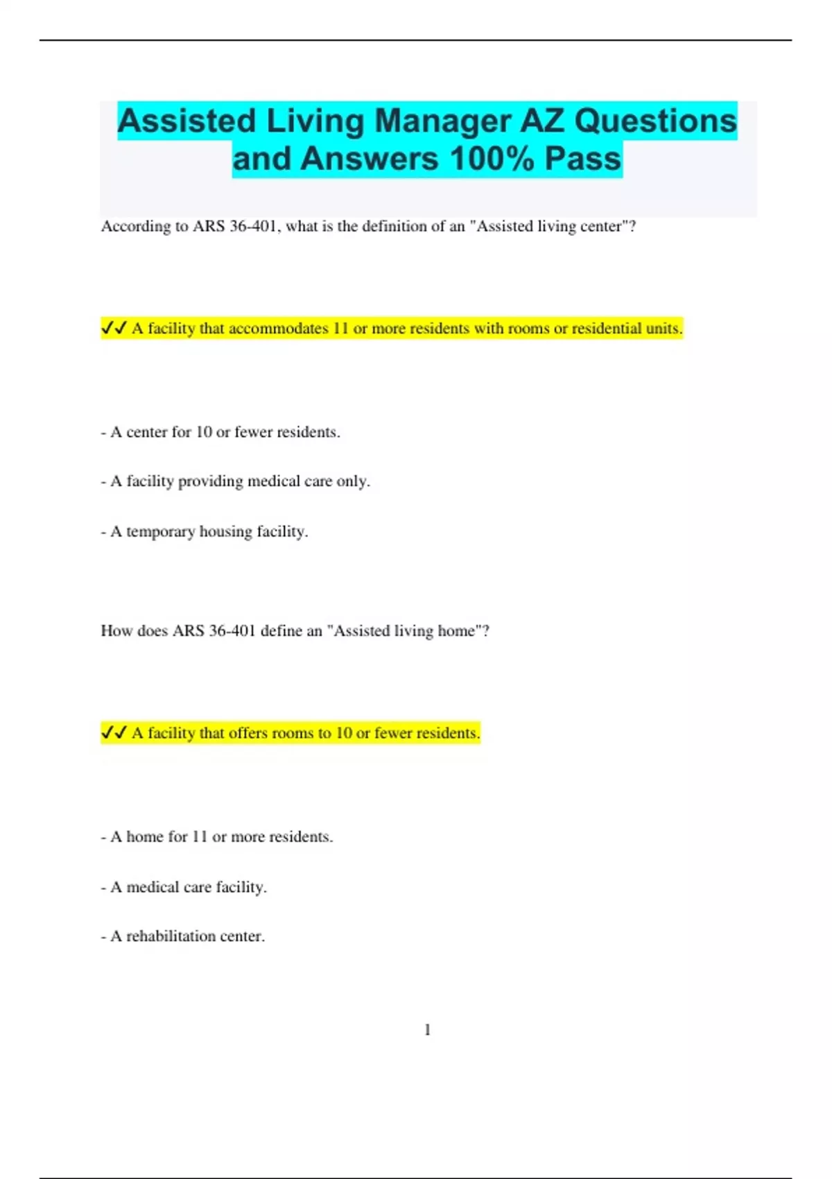 Assisted Living Manager AZ Questions and Answers 100% Pass According to ARS 36-401, what is the definition of an "Assisted living center"? A facility that accommodates 11 or more residents with rooms or residential units. - A center for 10 or fewer residents. - A facility providing medical care only. - A temporary housing facility. How does ARS 36-401 define an "Assisted living home"? A facility that offers rooms to 10 or fewer residents. - A home for 11 or more residents. - A medical care facility. - A rehabilitation center. 2 What types of care can an assisted living facility be licensed to offer? Supervisory, personal, or directed levels of care. - Emergency, routine, and specialized care. - Only medical care. - Basic and advanced care. Under ARS 36-411, what are owners of residential care institutions and home health agencies required to do regarding potential employees? Make documented, good faith efforts to contact previous employers or references to evaluate the person's fitness to work. - Perform background checks only. - Hire without reference checks. - Conduct interviews only. 3 Does "Assisted living services" refer to curative, restorative, and preventative aspects of nursing care performed under the supervision of a registered nurse or directed by a physician? False - True - Sometimes - Only under specific conditions Does "Residential unit" mean a private apartment that includes living and sleeping space, a kitchen area, a private bath, and storage,