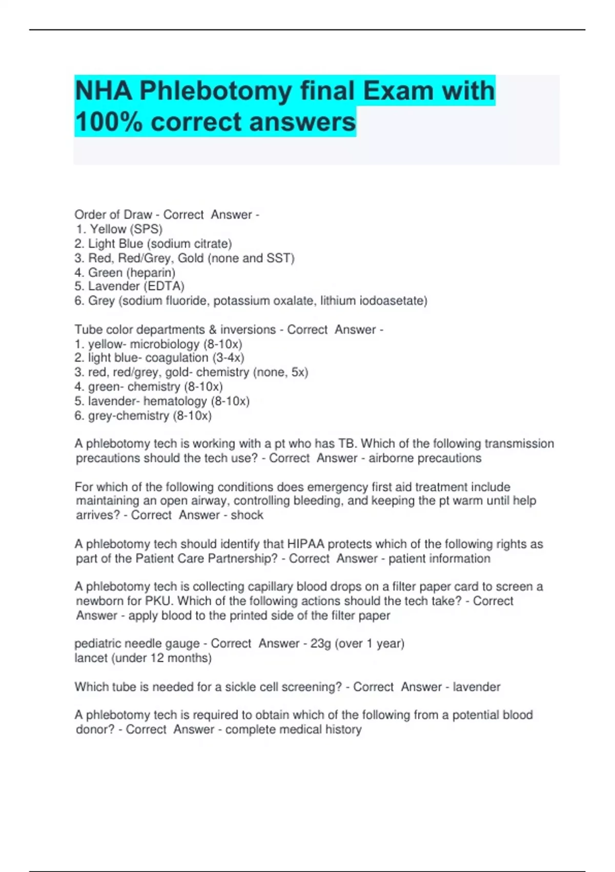 NHA Phlebotomy final Exam with 100- correct answers.