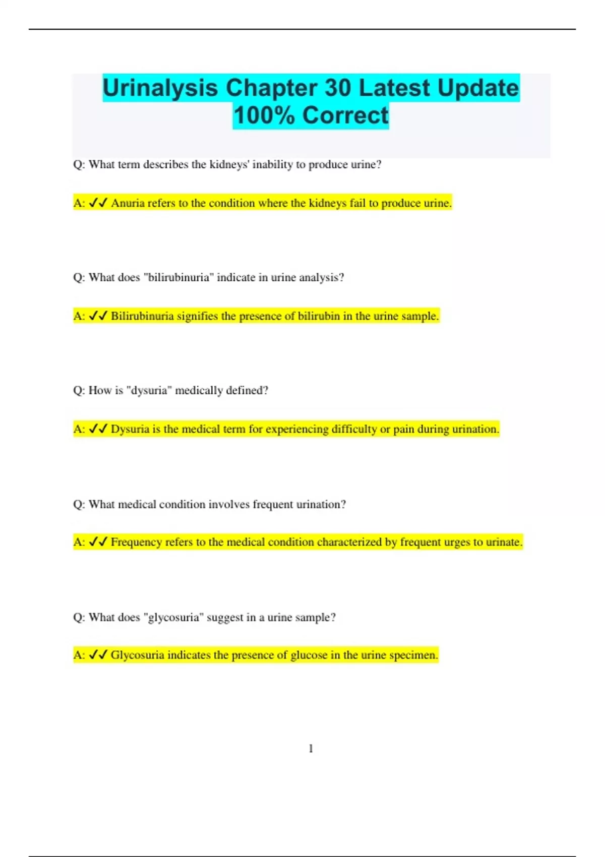 Urinalysis Chapter 30 Latest Update 100% Correct Q: What term describes the kidneys' inability to produce urine? A: Anuria refers to the condition where the kidneys fail to produce urine. Q: What does "bilirubinuria" indicate in urine analysis? A: Bilirubinuria signifies the presence of bilirubin in the urine sample. Q: How is "dysuria" medically defined? A: Dysuria is the medical term for experiencing difficulty or pain during urination. Q: What medical condition involves frequent urination? A: Frequency refers to the medical condition characterized by frequent urges to urinate. Q: What does "glycosuria" suggest in a urine sample? A: Glycosuria indicates the presence of glucose in the urine specimen. 2 Q: What does "hematuria" indicate in urine testing? A: Hematuria indicates the presence of blood in the urine. Q: What does "ketonuria" reveal in urine analysis? A: Ketonuria reveals the presence of ketone bodies in the urine sample. Q: What is "ketosis" in terms of bodily fluids? A: Ketosis refers to the state where there is an accumulation of ketone bodies in bodily tissues and fluids. Q: What term describes the act of voiding urine? A: Micturition describes the physiological act of emptying the bladder by urination. Q: What is the functional unit of the kidney? A: The nephron is considered the functional unit responsible for kidney function. Q: What condition involves excessive nighttime urination? A: Nocturia is characterized by excessive urination during the night. 3 Q: What does "nocturnal enuresis" denote in medical terms? A: Nocturnal enuresis refers to the involuntary release of urine during sleep, often termed bedwetting. Q: How is "oliguria" defined regarding