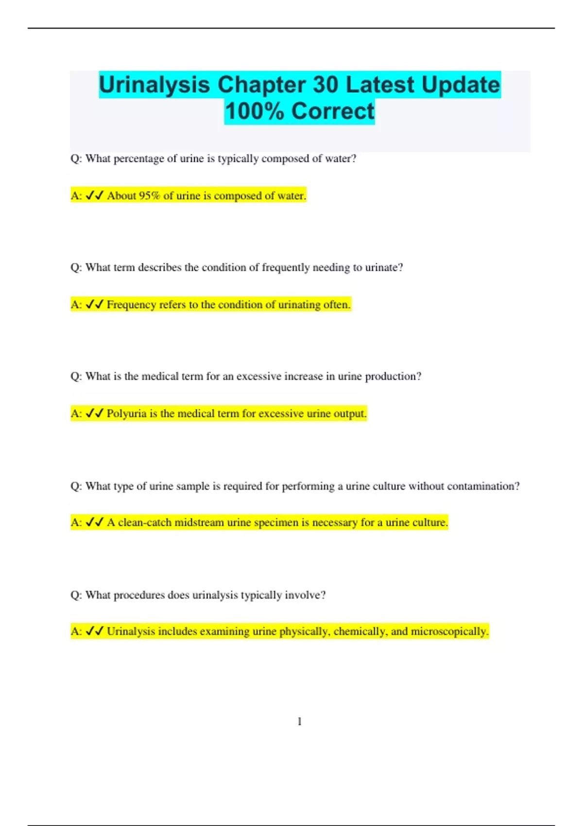 Urinalysis Chapter 30 Latest Update 100% Correct Q: What percentage of urine is typically composed of water? A: About 95% of urine is composed of water. Q: What term describes the condition of frequently needing to urinate? A: Frequency refers to the condition of urinating often. Q: What is the medical term for an excessive increase in urine production? A: Polyuria is the medical term for excessive urine output. Q: What type of urine sample is required for performing a urine culture without contamination? A: A clean-catch midstream urine specimen is necessary for a urine culture. Q: What procedures does urinalysis typically involve? A: Urinalysis includes examining urine physically, chemically, and microscopically. 2 Q: Does a light yellow color in a urine specimen indicate bacterial presence? A: No, a light yellow color does not indicate bacterial presence; cloudy urine might. Q: Is the pH of most urine specimens neutral? A: No, the pH of most urine specimens is acidic, not neutral. Q: Can menstruation lead to blood being normally present in urine? A: Yes, blood may be present in urine during menstruation. Q: What does the term "hematuria" mean? A: Hematuria refers to the presence of blood in the urine. Q: Which hormone is found in the urine and blood of pregnant women? A: HCG (human chorionic gonadotropin) is present in the urine and blood of pregnant women. Q: Is urea a byproduct of water breakdown? A: No, urea is a waste product derived from protein breakdown. 3 Q: Does a normal adult typically excrete about 250 mL of urine per day? A: No, a normal adult excretes approximately 750-2000 mL of urine daily. Q: Can vomiting lead to reduced urine output (oliguria)? A: Yes, vomiting can result in oliguria. Q: Are microorganisms typically found in the distal urethra? A: Yes, microorganisms are normally present in the distal urethra. Q: Is a 24-hour urine collection usually performed to diagnose UTIs? A: No, a 24-hour urine collection is not typically used for diagnosing UTIs. Q: Does the pH of a urine specimen